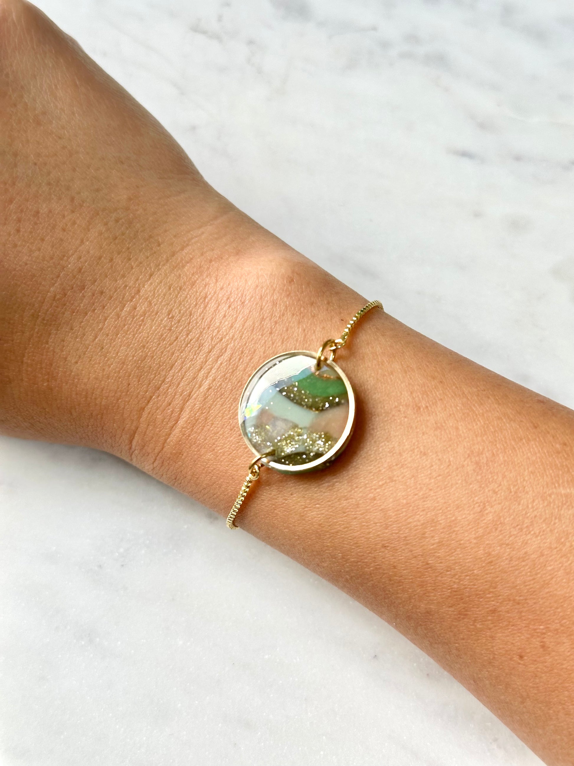 This stunning handmade clay bracelet captures the intricate beauty of natural agate. Handcrafted layer by layer with earthy tones and touches of gold, each piece mimics gemstone bands and shimmering depths. Lightweight yet elegant, they bring sophisticated artistry to any look – a unique, statement accessory crafted just for you.