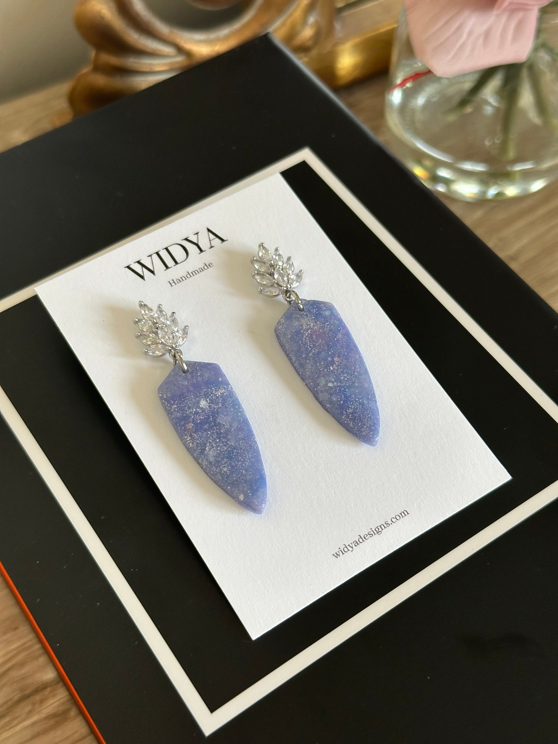 These handcrafted earrings capture the serene beauty of aquamarine with polymer clay, meticulously shaped and polished to mimic the real thing. Their stunning blue hues and elegant design make them a perfect blend of artistry and sophistication—lightweight, timeless, and effortlessly chic. look – a unique, statement accessory crafted just for you.