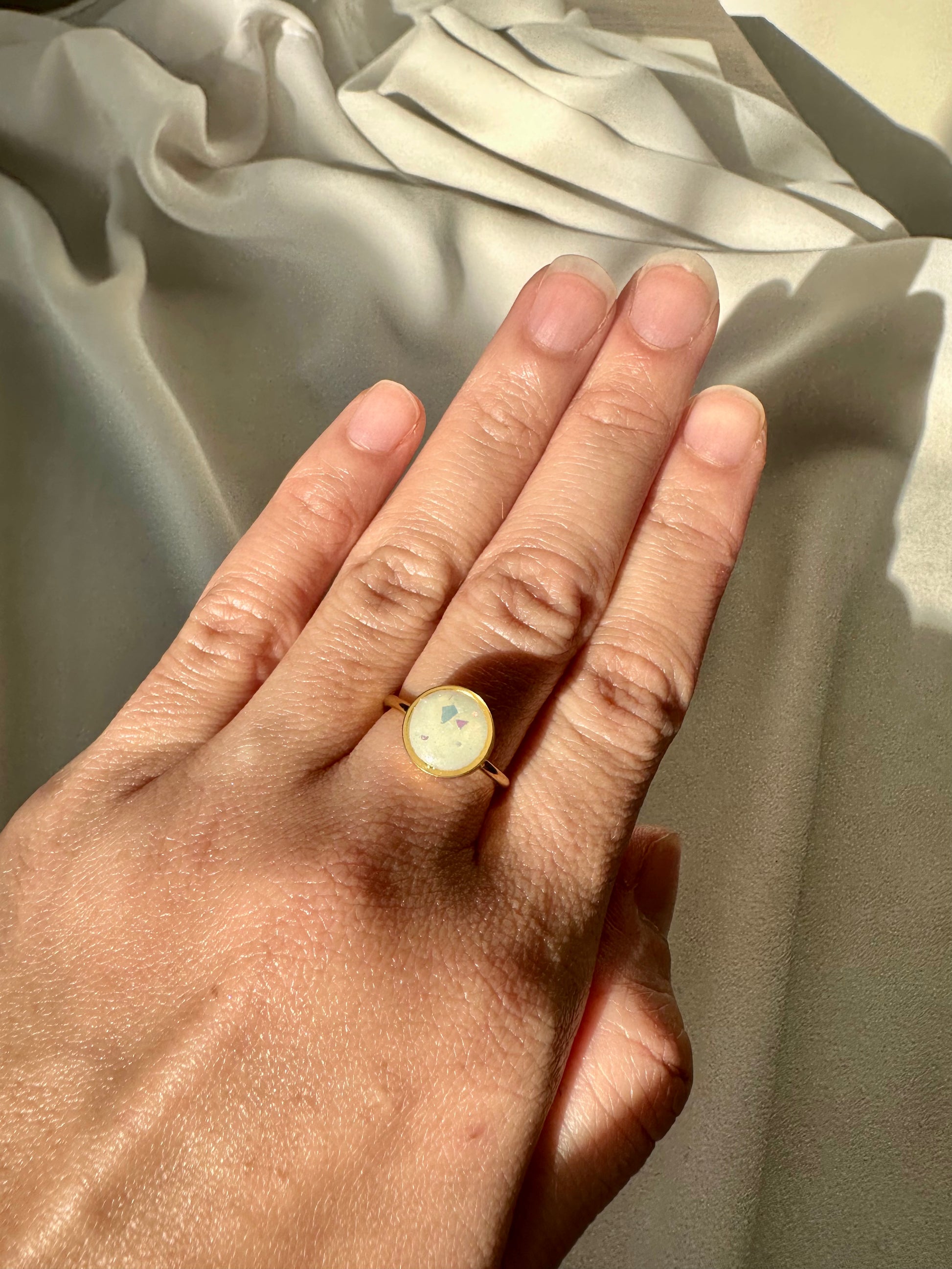 Elevate your style with this adjustable, high-quality ring bezel featuring a stunning opal polymer clay center. A chic blend of elegance and handmade charm, perfect for any occasion!