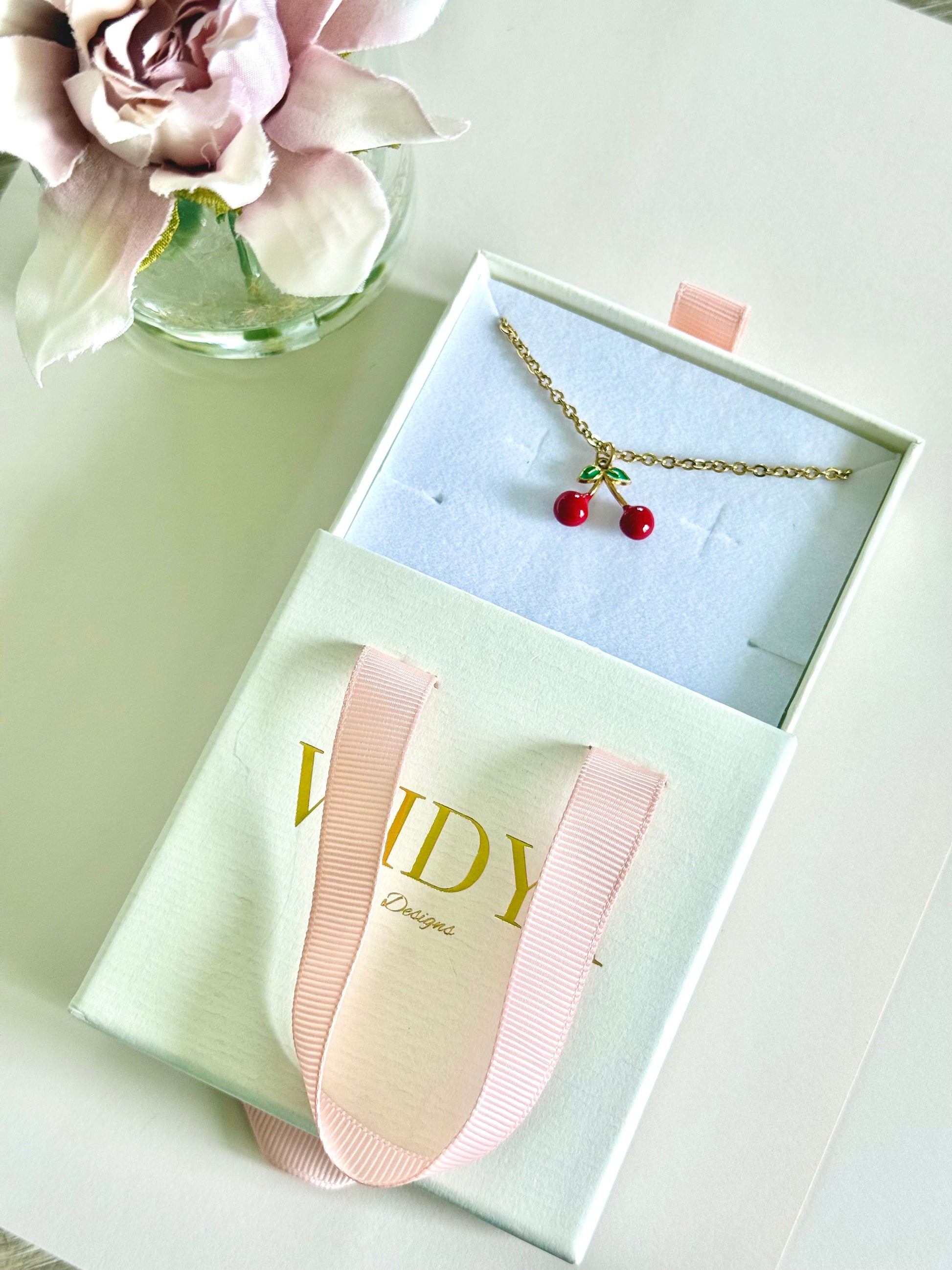 Sweet and playful, this Cherry Necklace is made to brighten your day! Featuring a charming cherry pendant on an 18K gold PVD stainless steel chain that is non-tarnish, waterproof, and hypoallergenic—perfect for everyday wear. Dressing up or keeping it casual, this necklace adds a cherry-sweet touch of fun and charm to your look.