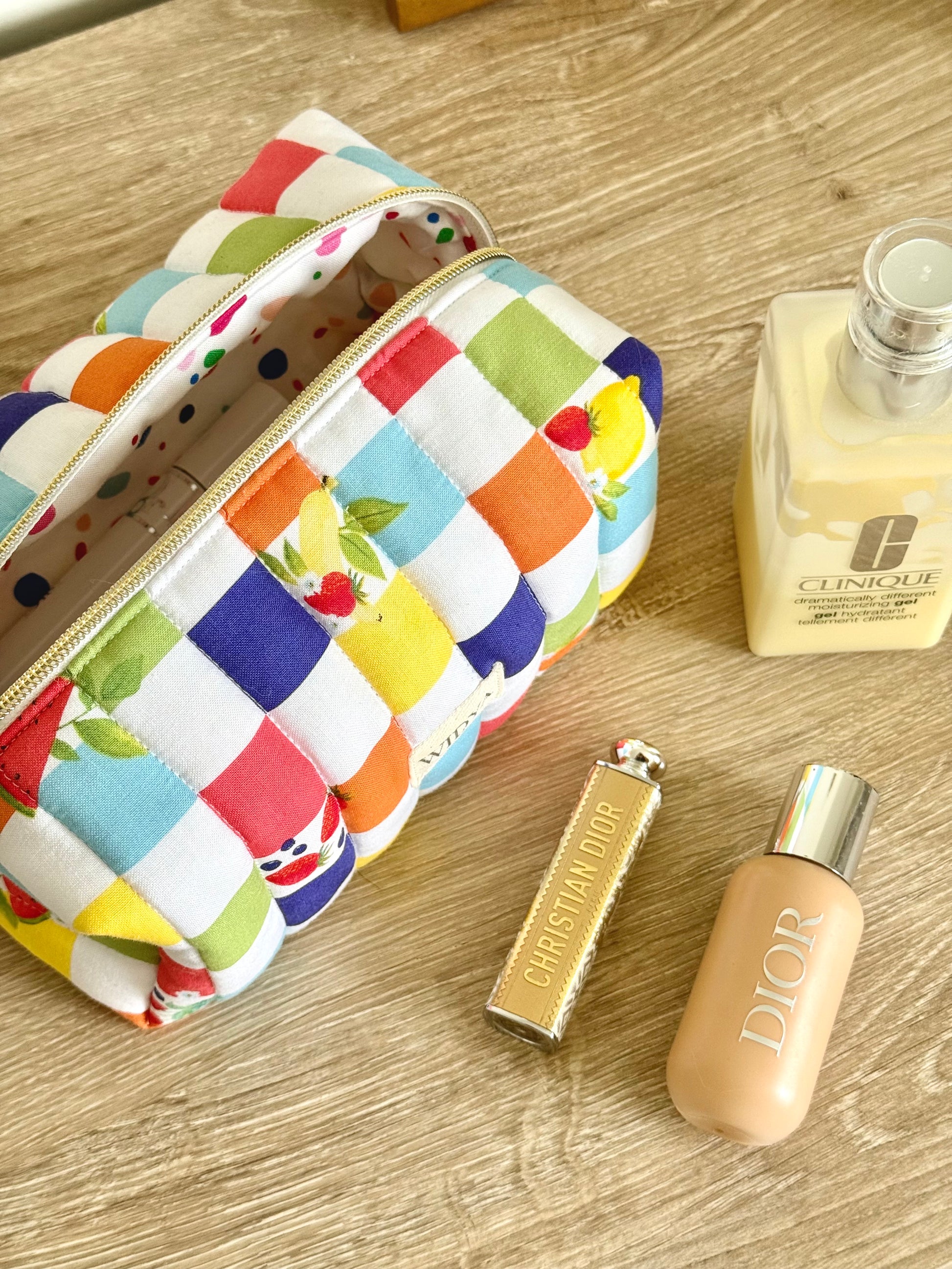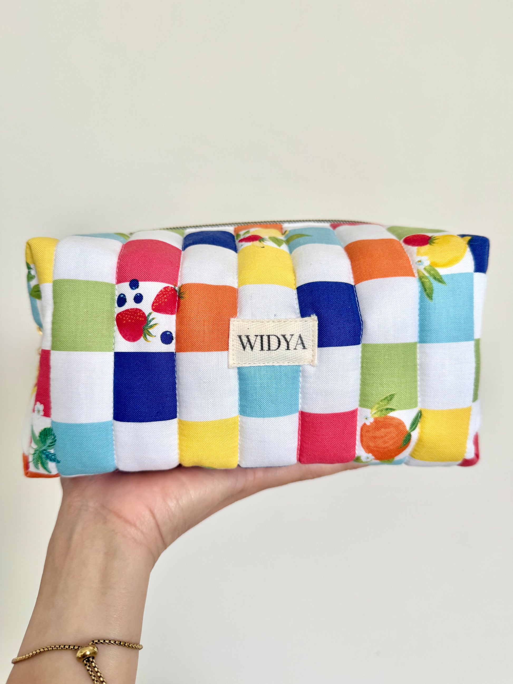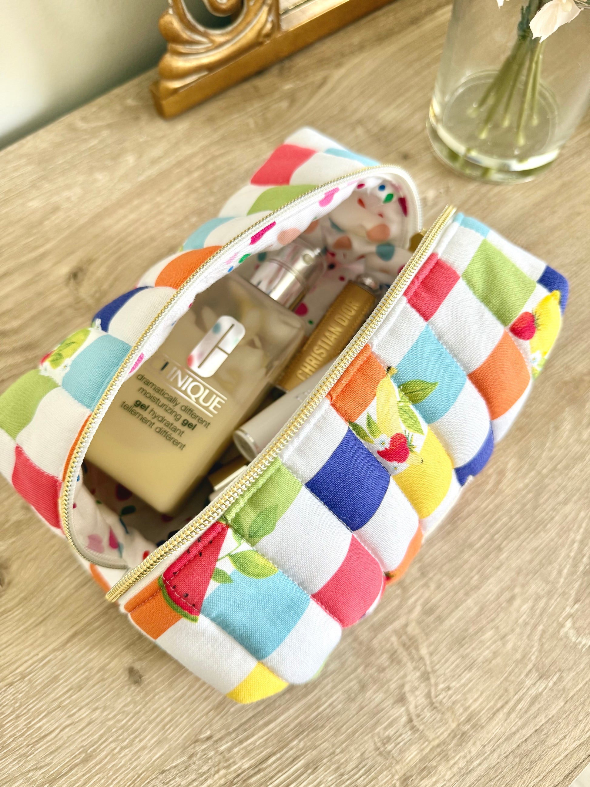 Bright, playful, and full of personality, this colorful checkered fruity print is a total mood-lifter. With its mix of vibrant colors and sweet little fruits, this bag adds a splash of joy to your daily routine. Perfect for storing makeup, snacks, or anything that makes you smile.