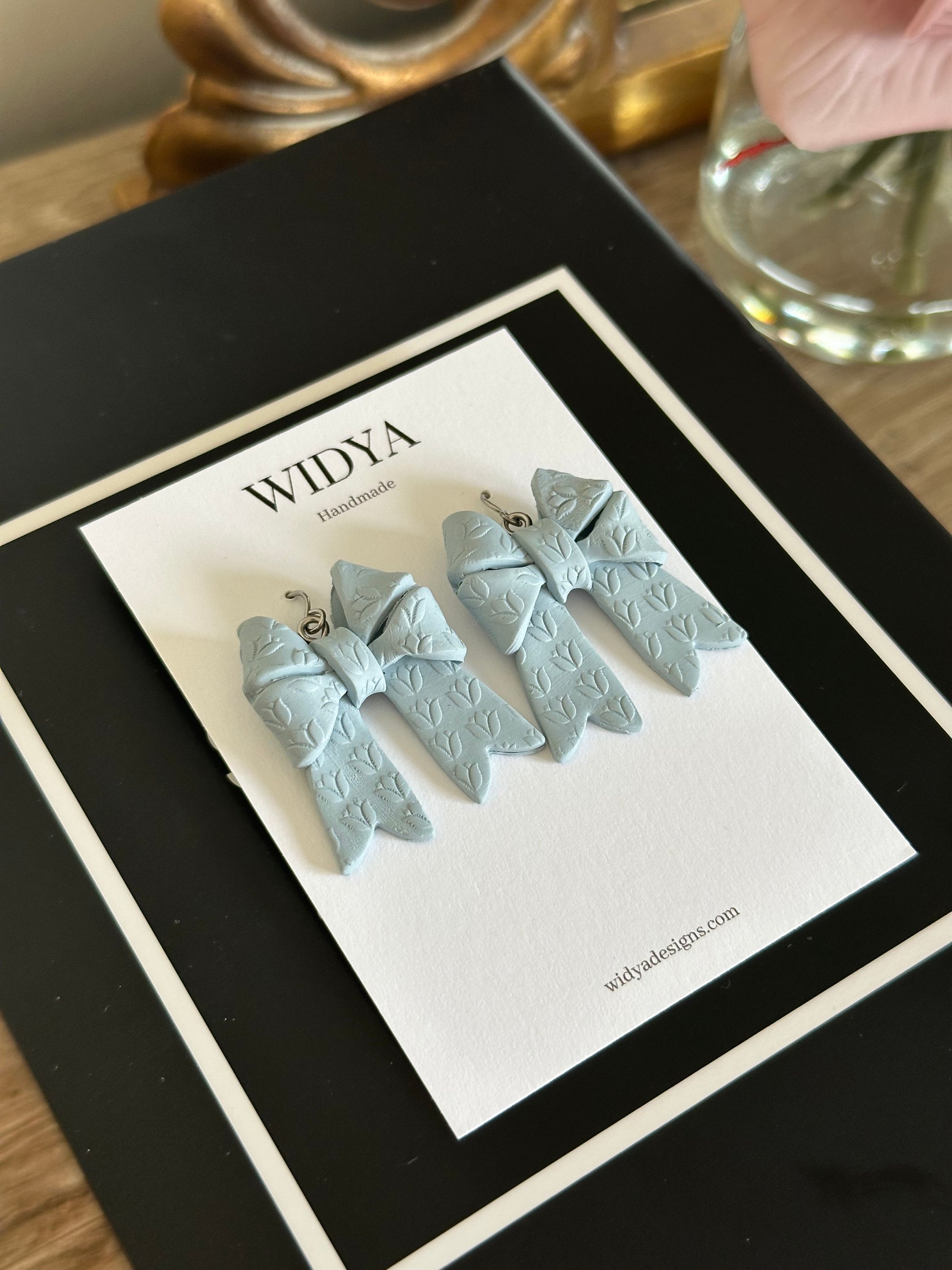 Delicately handcrafted, these blue bow earrings feature a charming tulip-textured design, adding a unique touch to their soft, romantic look. Made from polymer clay, they are lightweight yet elegant, perfect for adding a sweet and feminine flair to any outfit. A must-have for lovers of coquette and vintage-inspired styles!