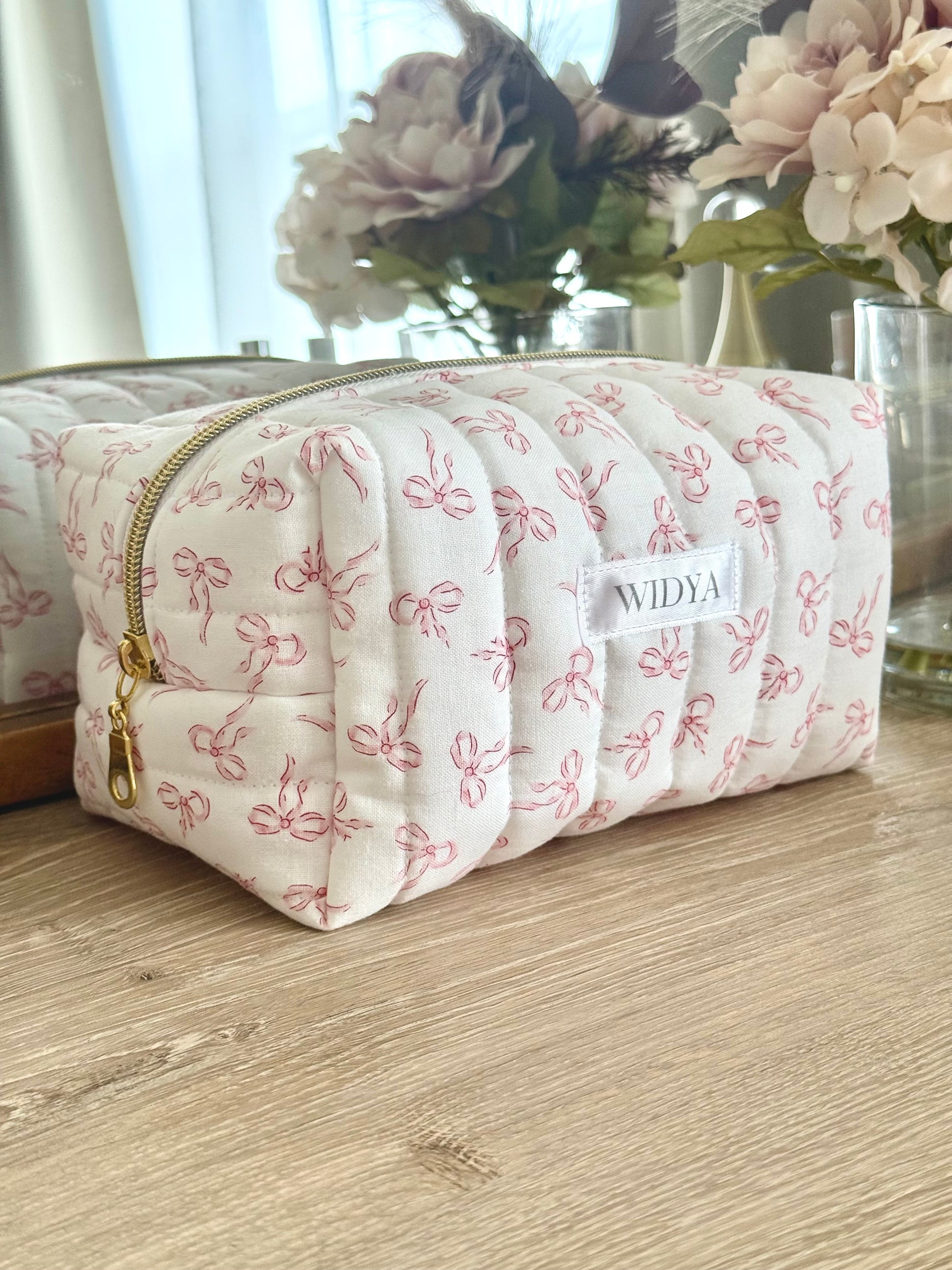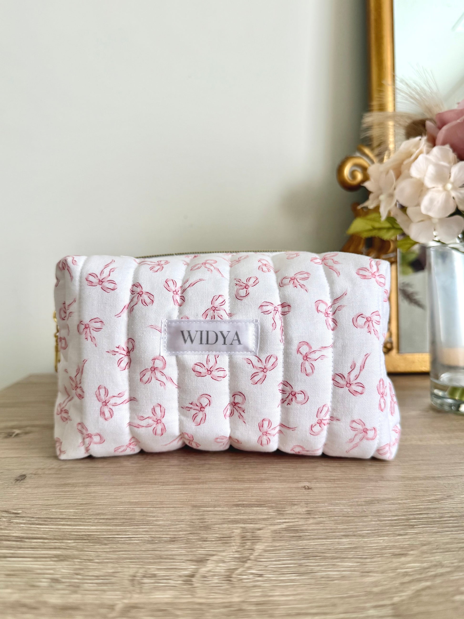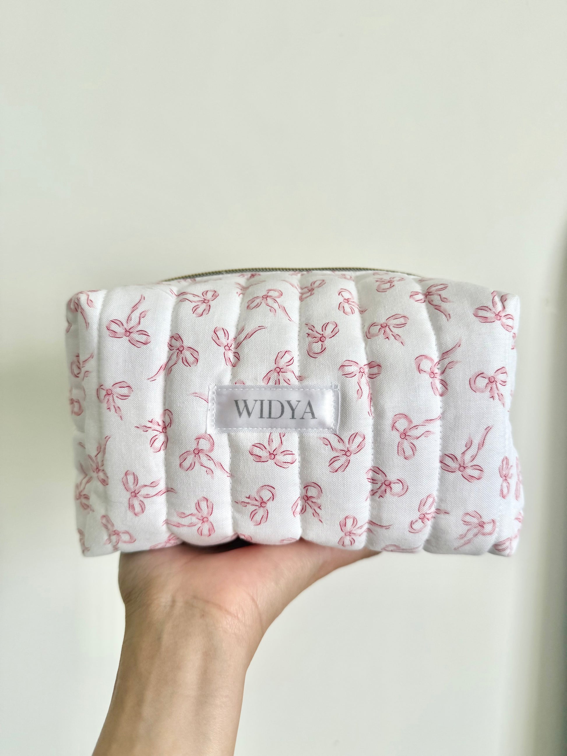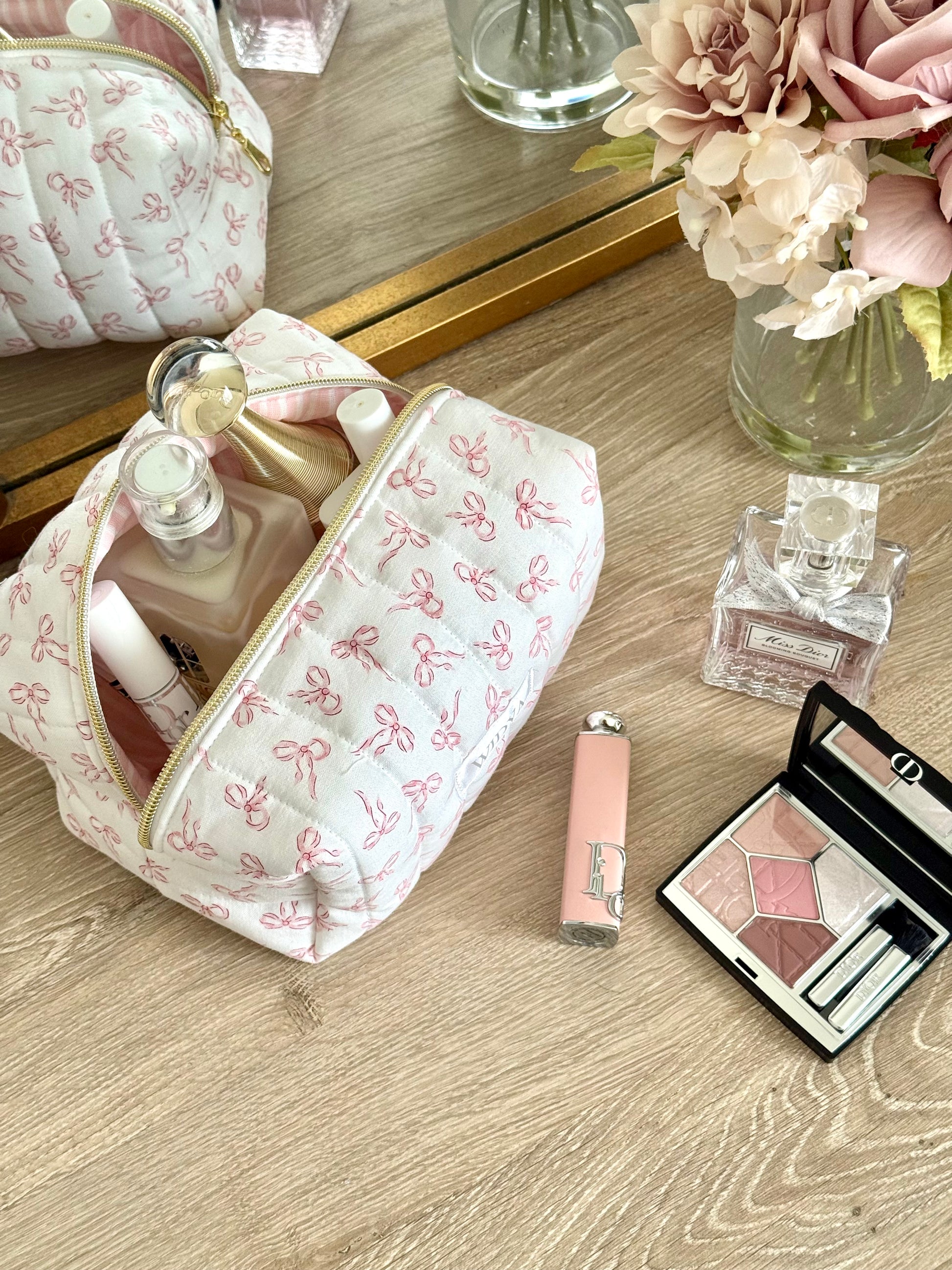 Charming and effortlessly cute, this quilted makeup bag features a delicate pattern of pink bows that feels sweet and timeless. Its soft, girly aesthetic is perfect for anyone who loves subtle details and a handmade touch. It makes every day routines feel a little more special like a small treat just for you.
