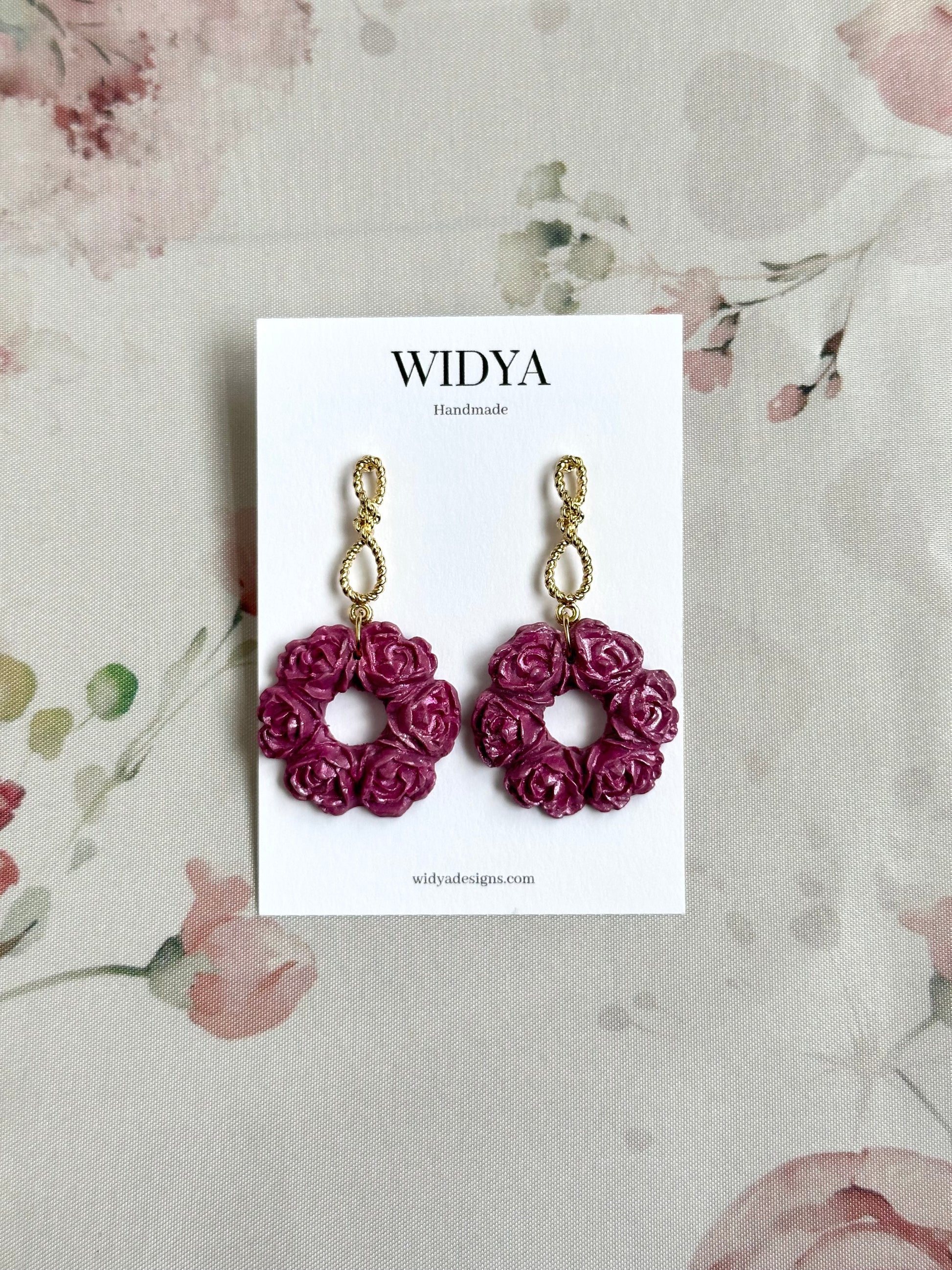 A delicate circle of blossoms in a soft mauve hue, these earrings capture the charm of a flower crown in a wearable form. Effortlessly feminine with a touch of vintage grace.