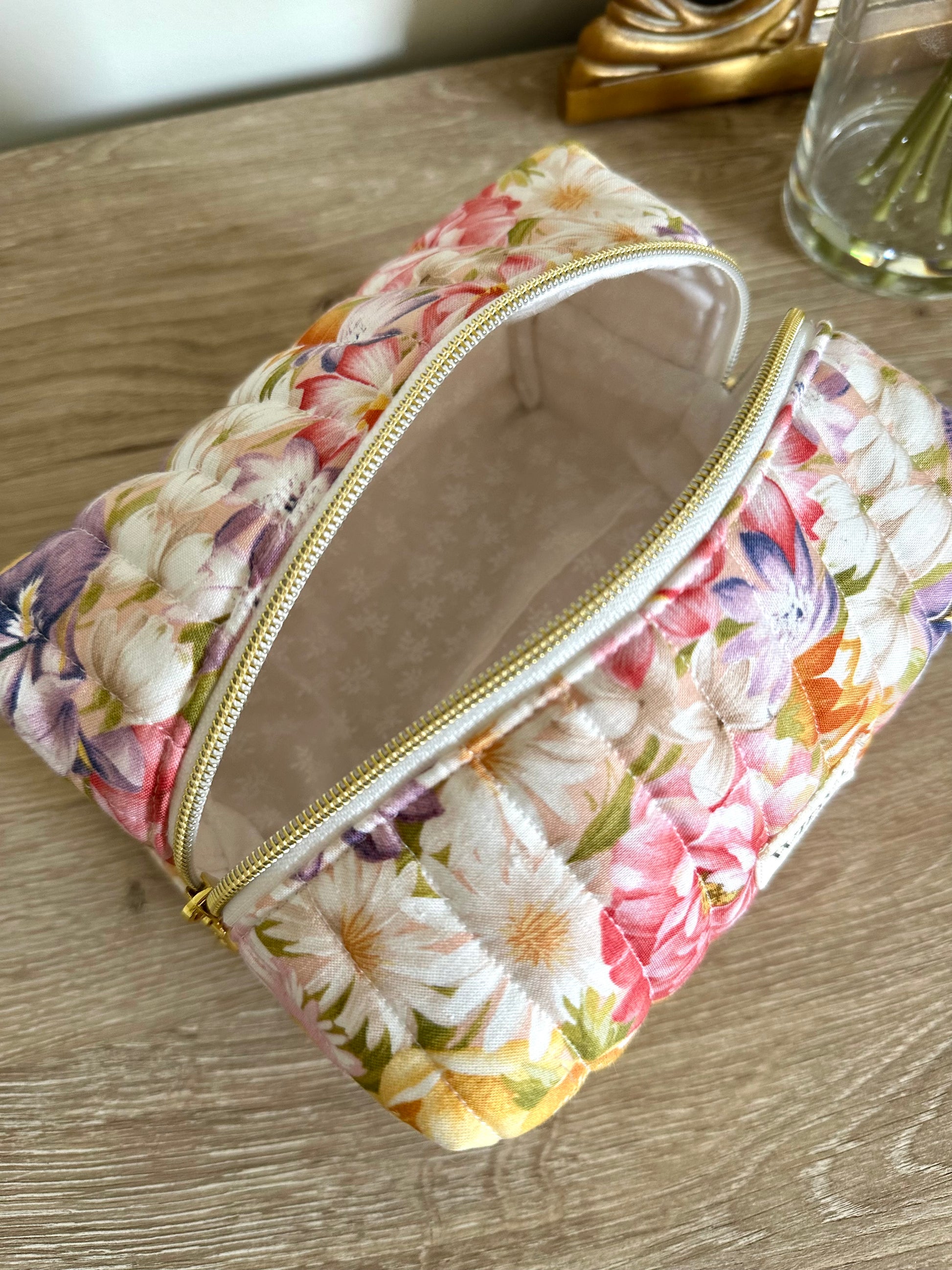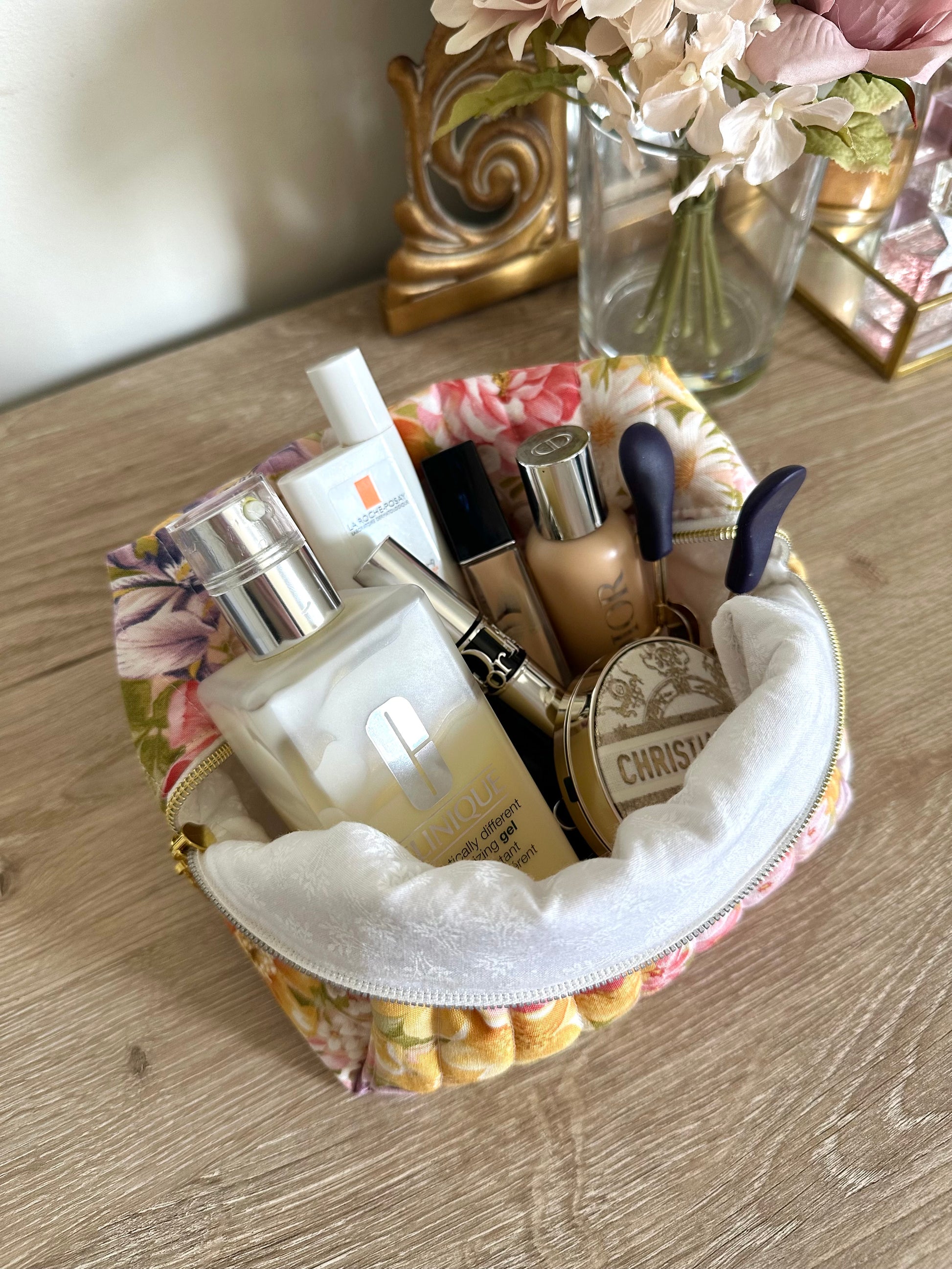 A little beauty for your everyday essentials! This handmade quilted makeup bag is made from 100% cotton and adorned with a charming flower garden pattern. Soft yet structured, it’s spacious enough to hold your makeup, skincare, or daily must-haves while keeping them neatly organized. Thoughtfully sewn with love, this bag is as practical as it is pretty, perfect for adding a touch of floral charm to your routine!