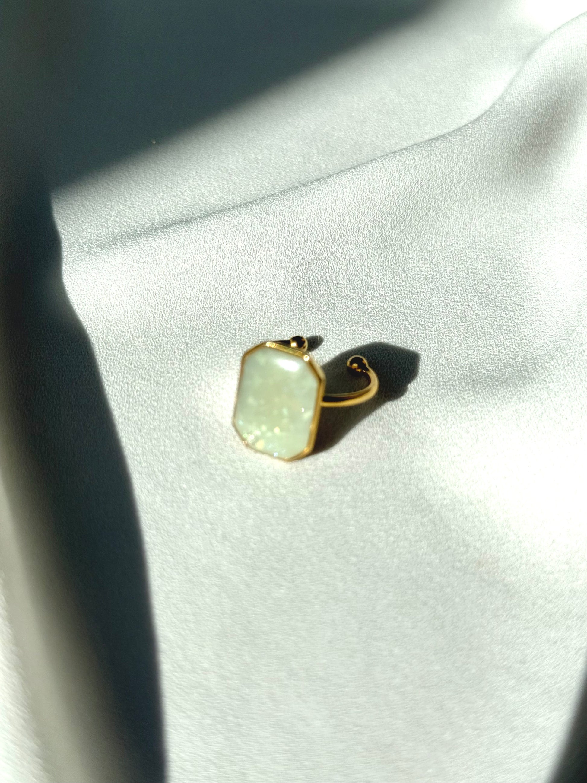 Elevate your style with this adjustable, high-quality ring features a handmade polymer clay center inspired by the soft shimmer of jade opal. Elegant, versatile, and full of artisanal detail.