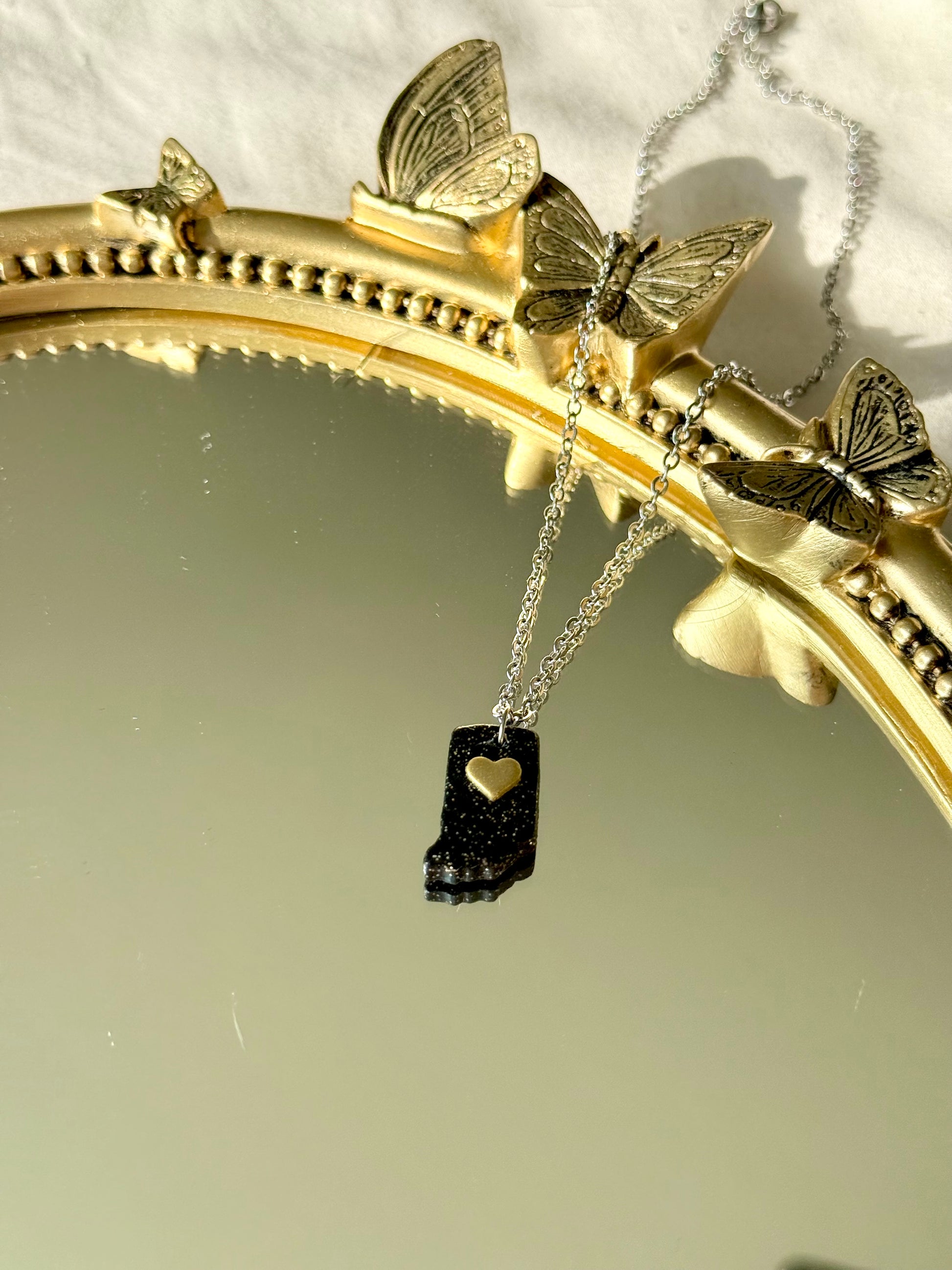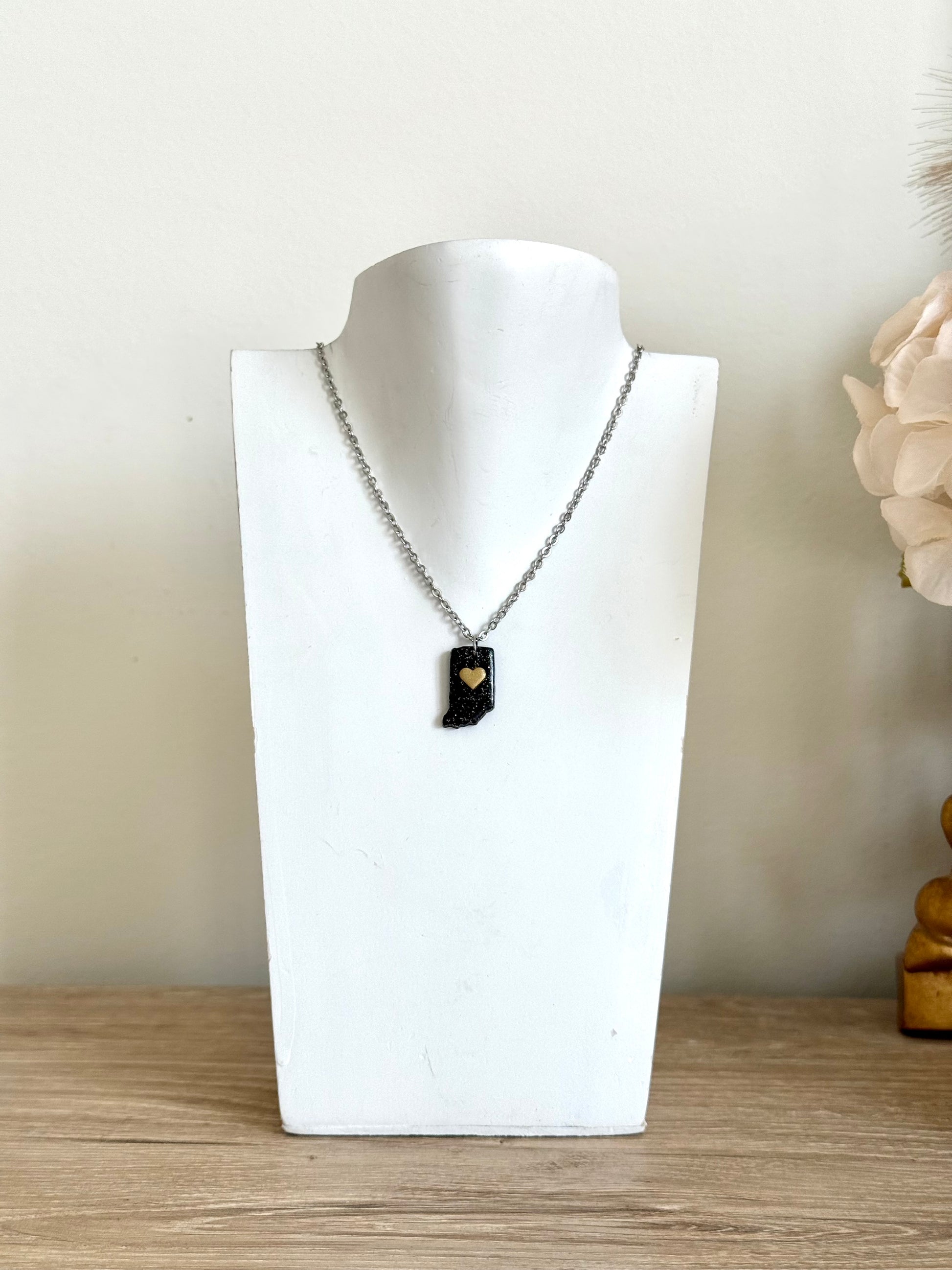 Show off your Indiana pride with this beautifully handmade necklace! Crafted with care in Indianapolis, this necklace features the iconic shape of the Hoosier state and come in vibrant black and gold color inspired by your favorite Indiana universities.