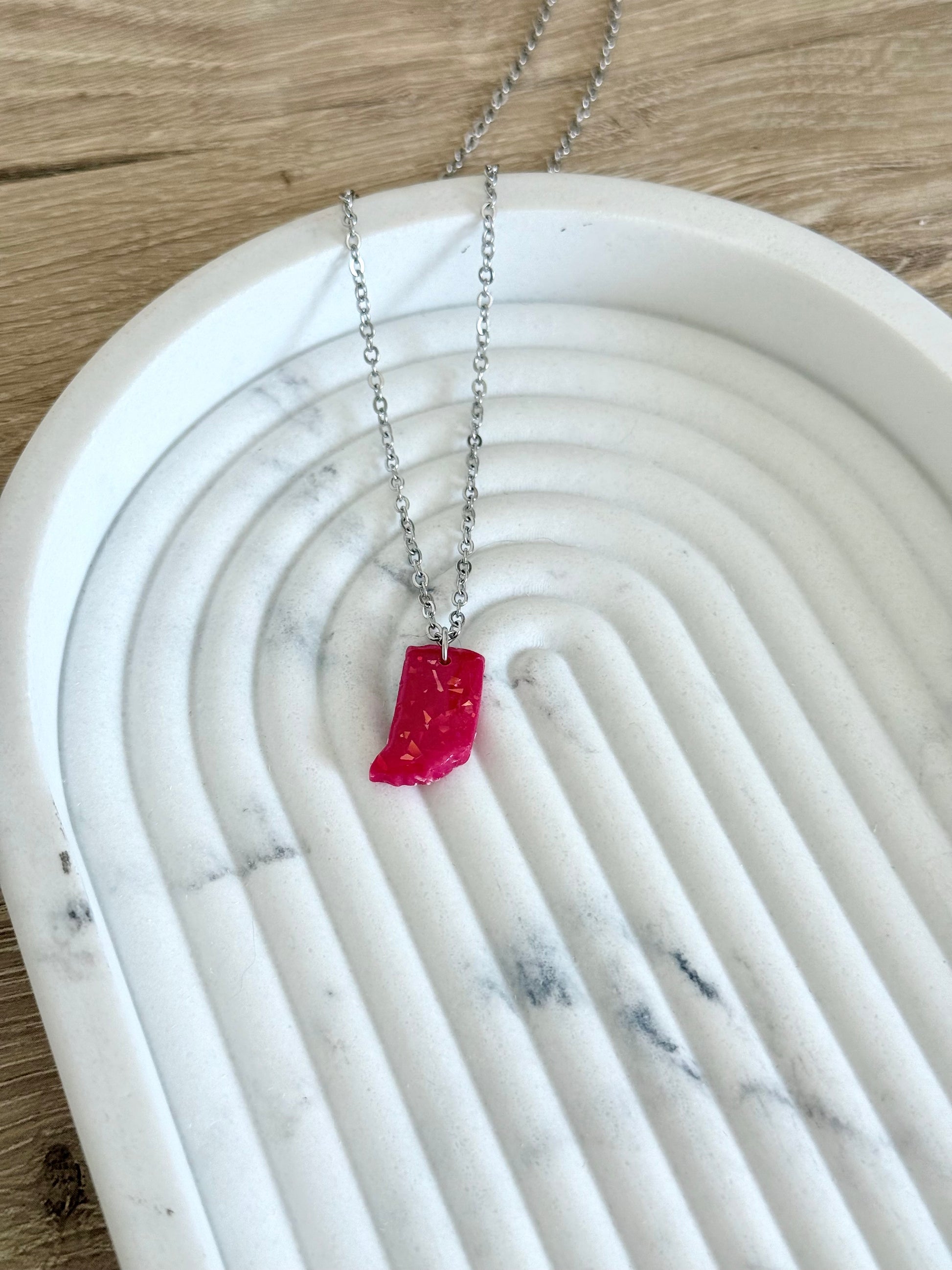 Show off your Hoosier pride with this red opal Indiana necklace that captures the fiery beauty of opal in polymer clay, handcrafted to resemble real gemstones. Bold yet lightweight, perfect to be worn on game day!