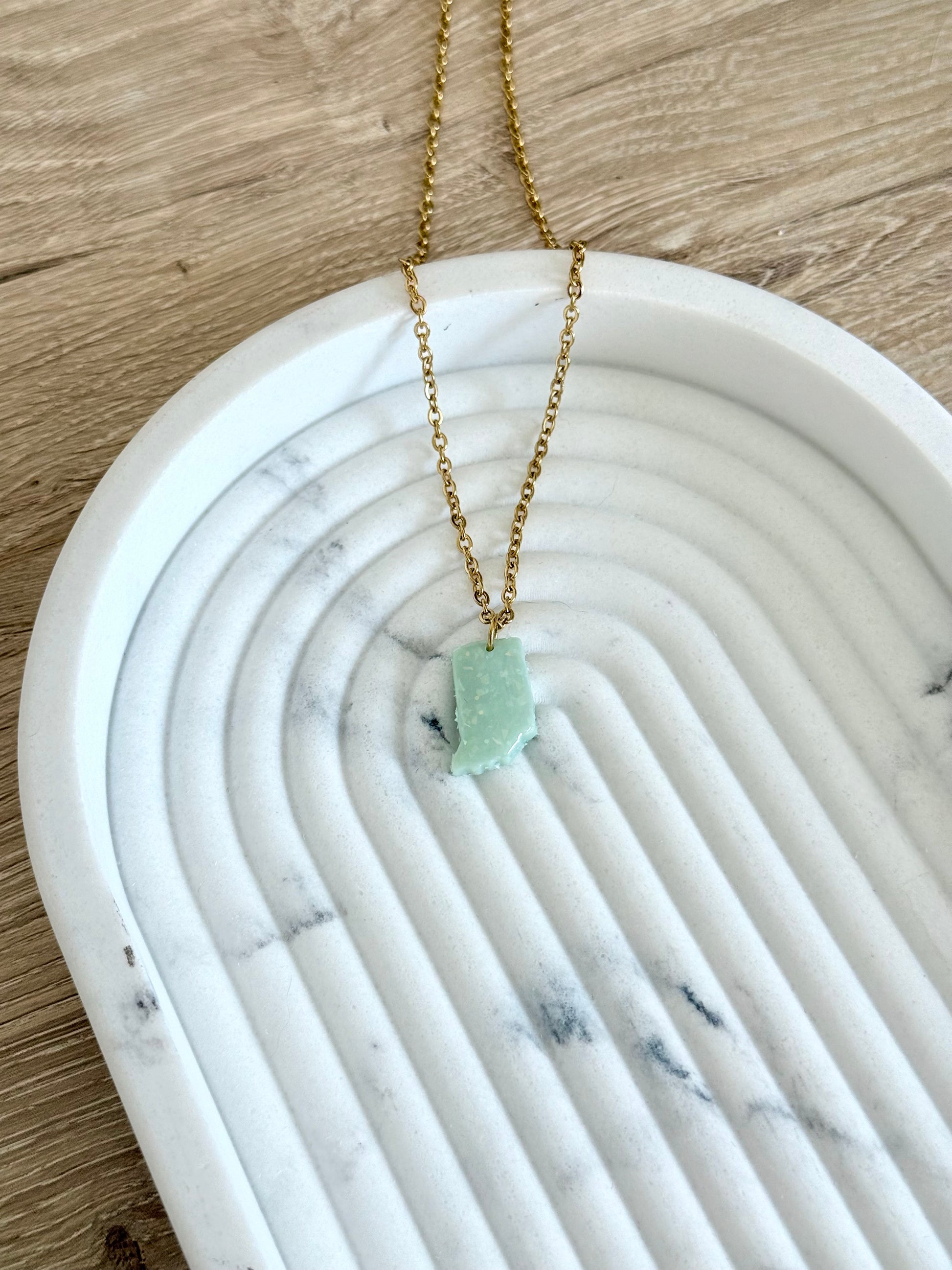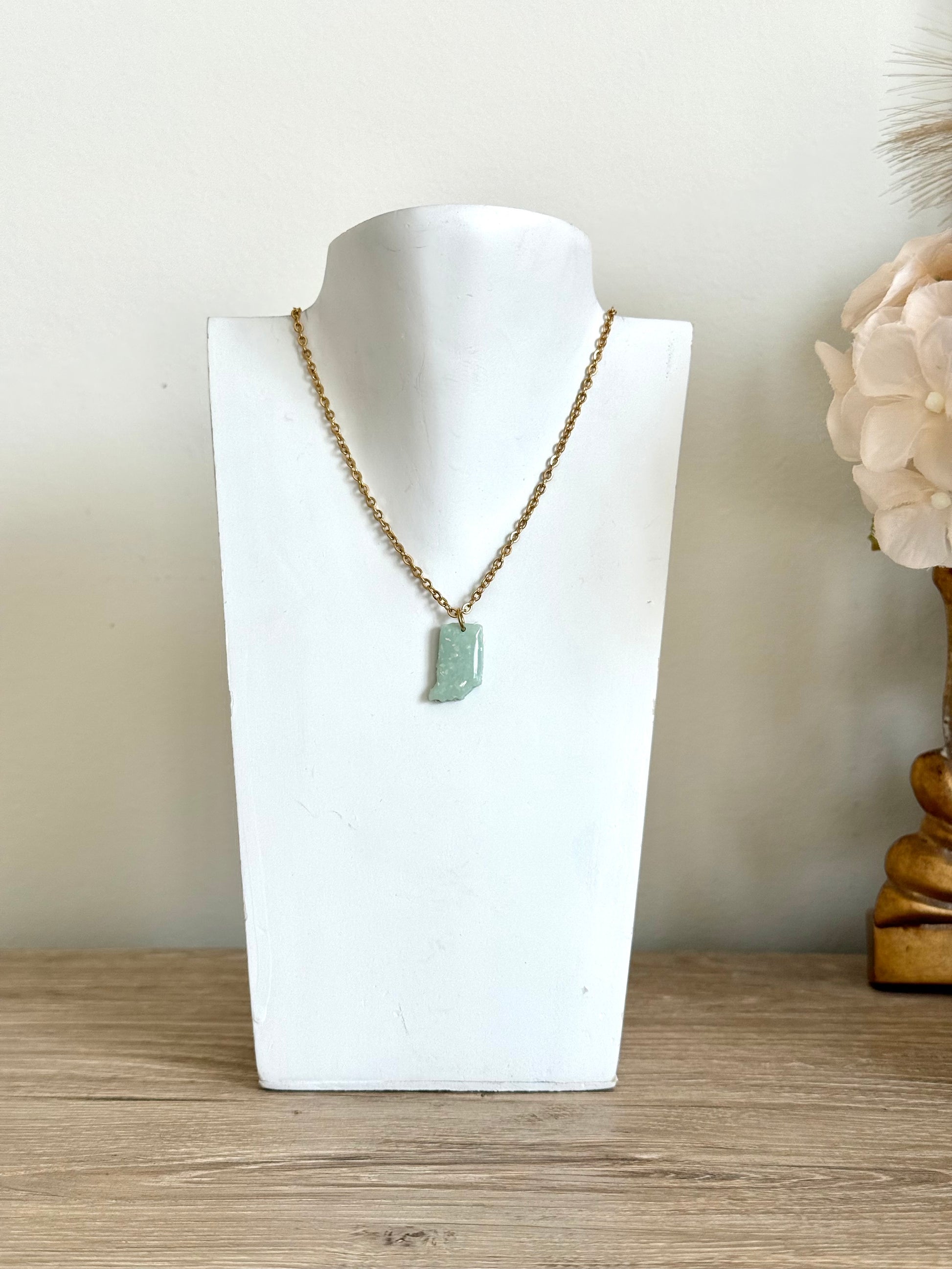 Show off your Indiana pride with this beautifully handmade necklace! Crafted with care in Indianapolis, this necklace features the iconic shape of the Hoosier state in shimmering teal opal and is meticulously handcrafted to resemble real gemstones.