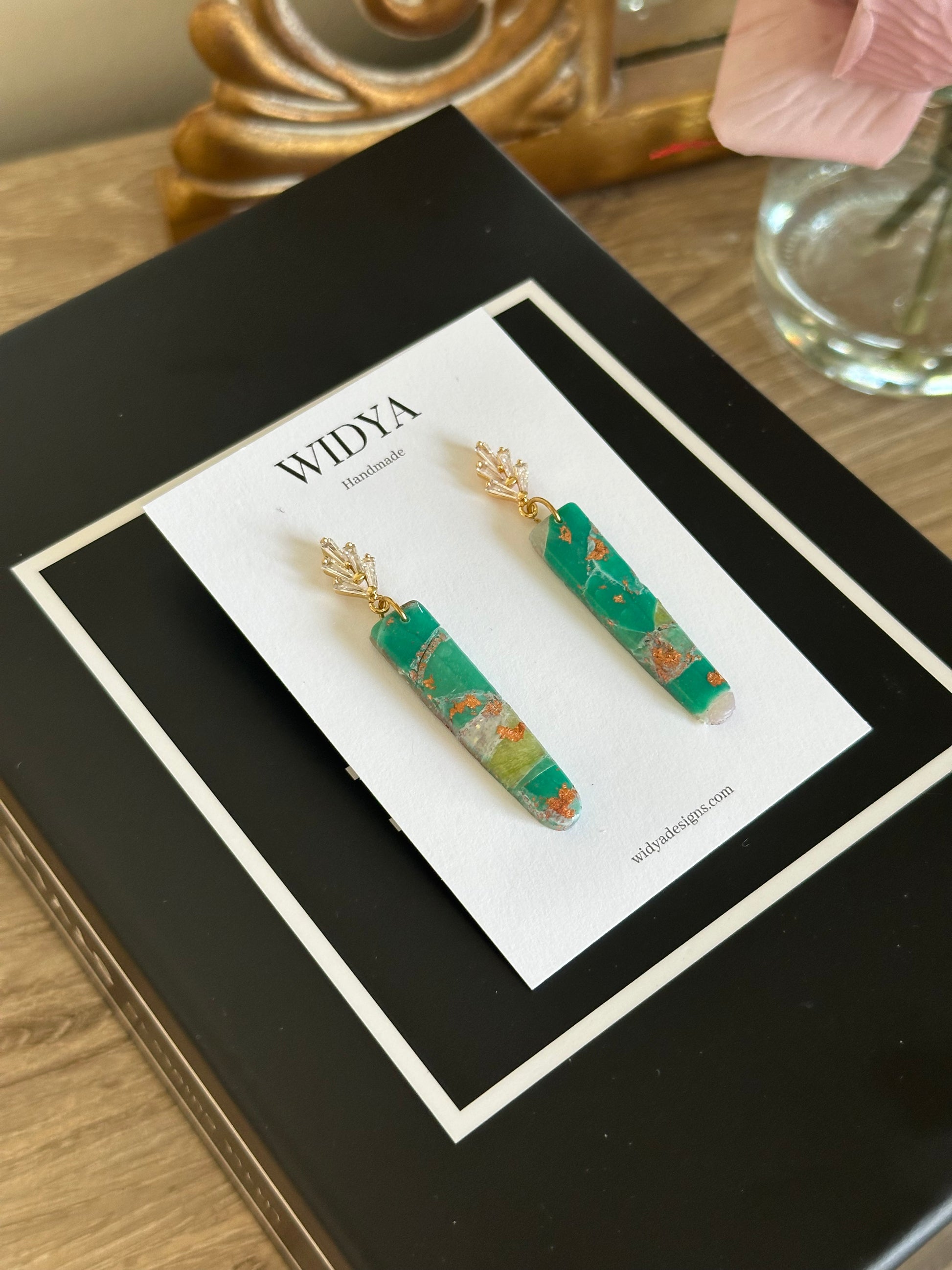 These stunning handmade clay earrings capture the intricate beauty of natural jade. Handcrafted layer by layer with earthy tones and touches of gold, each piece mimics gemstone bands and shimmering depths. Lightweight yet elegant, they bring sophisticated artistry to any look – a unique, statement accessory crafted just for you.