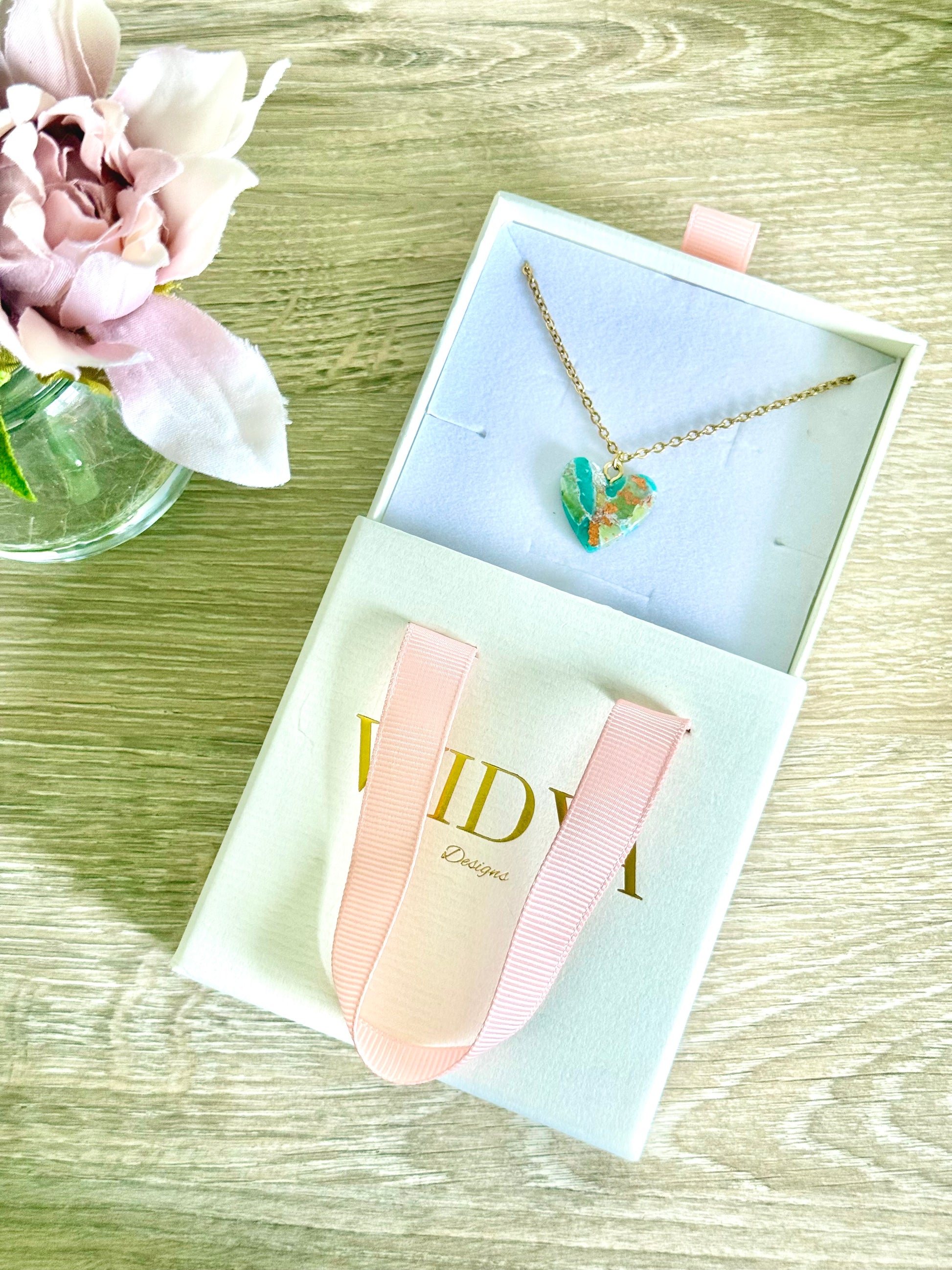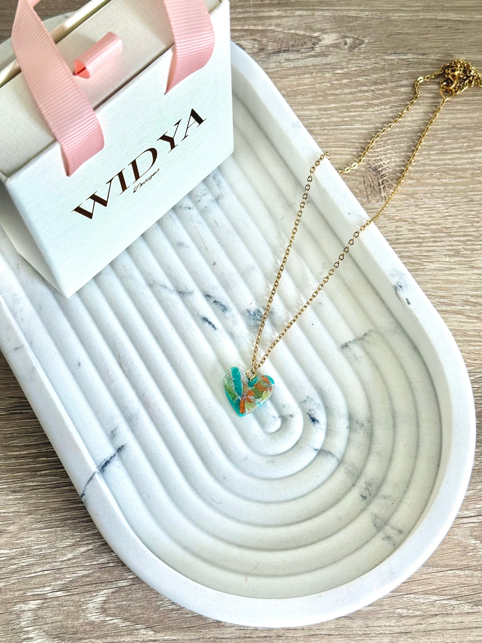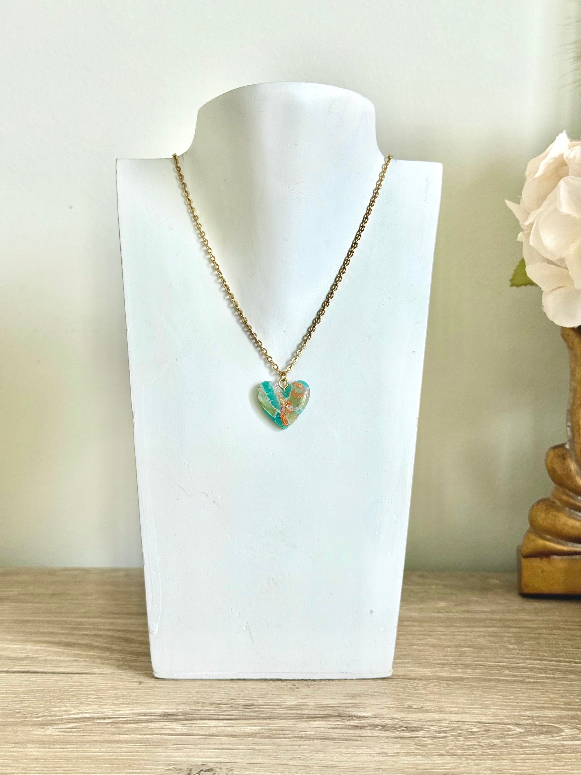 Graceful and timeless, this handmade heart pendant is crafted from polymer clay and inspired by the soothing beauty of jade. Symbolizing luck, harmony, and renewal, the butterfly charm brings a touch of meaning and elegance to your everyday look. Paired with an 18K gold PVD stainless steel chain that’s non-tarnish, waterproof, and hypoallergenic, it’s a piece made to carry with you through every season.