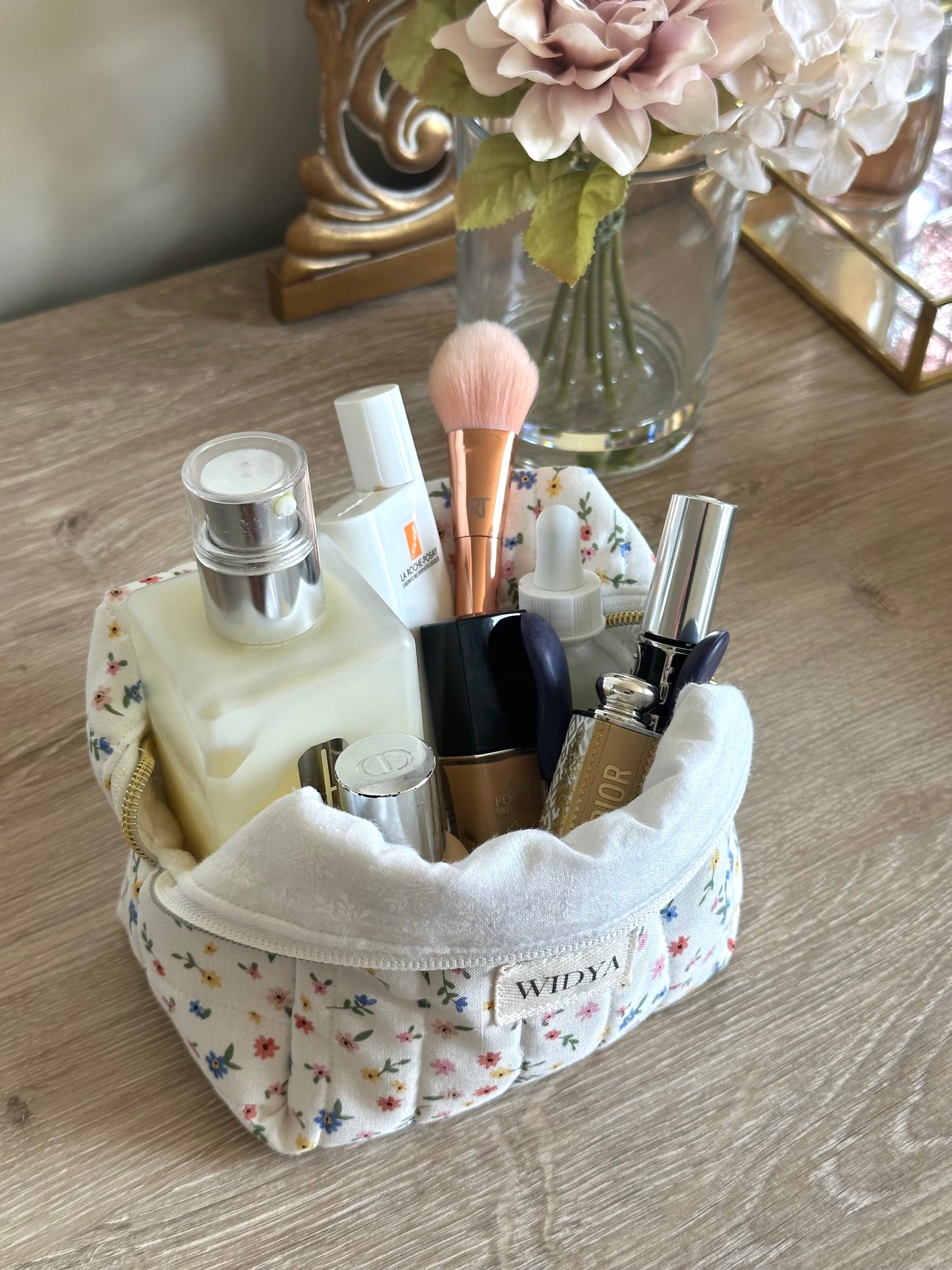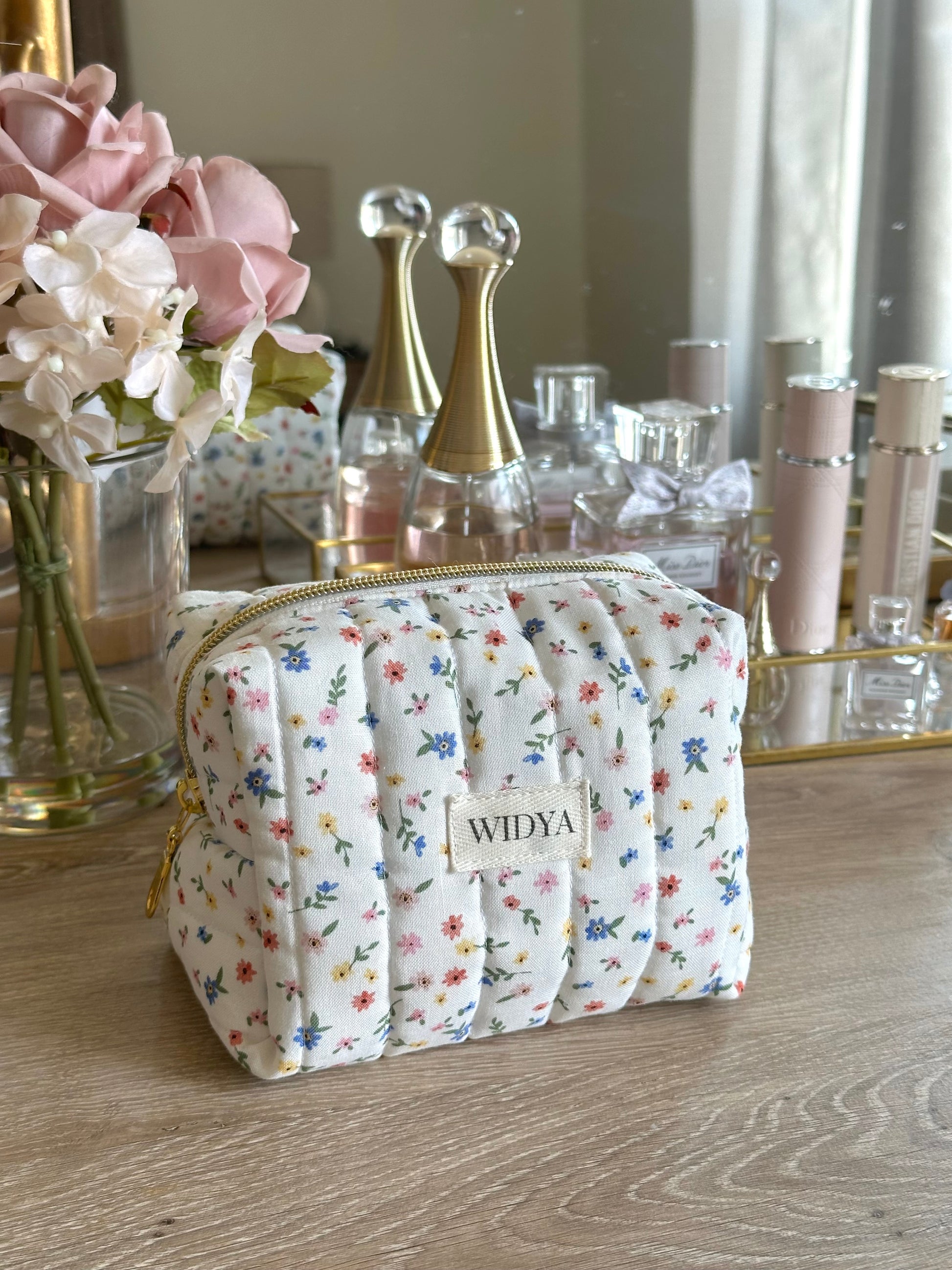 This pretty Wildflower Quilted Makeup Bag is made from 100% cotton. This handmade bag features a structured, roomy design perfect for storing makeup, toiletries, or daily must-haves. The delicate wildflower print, soft feminine aesthetic, and timeless appeal make it a stylish yet practical accessory.