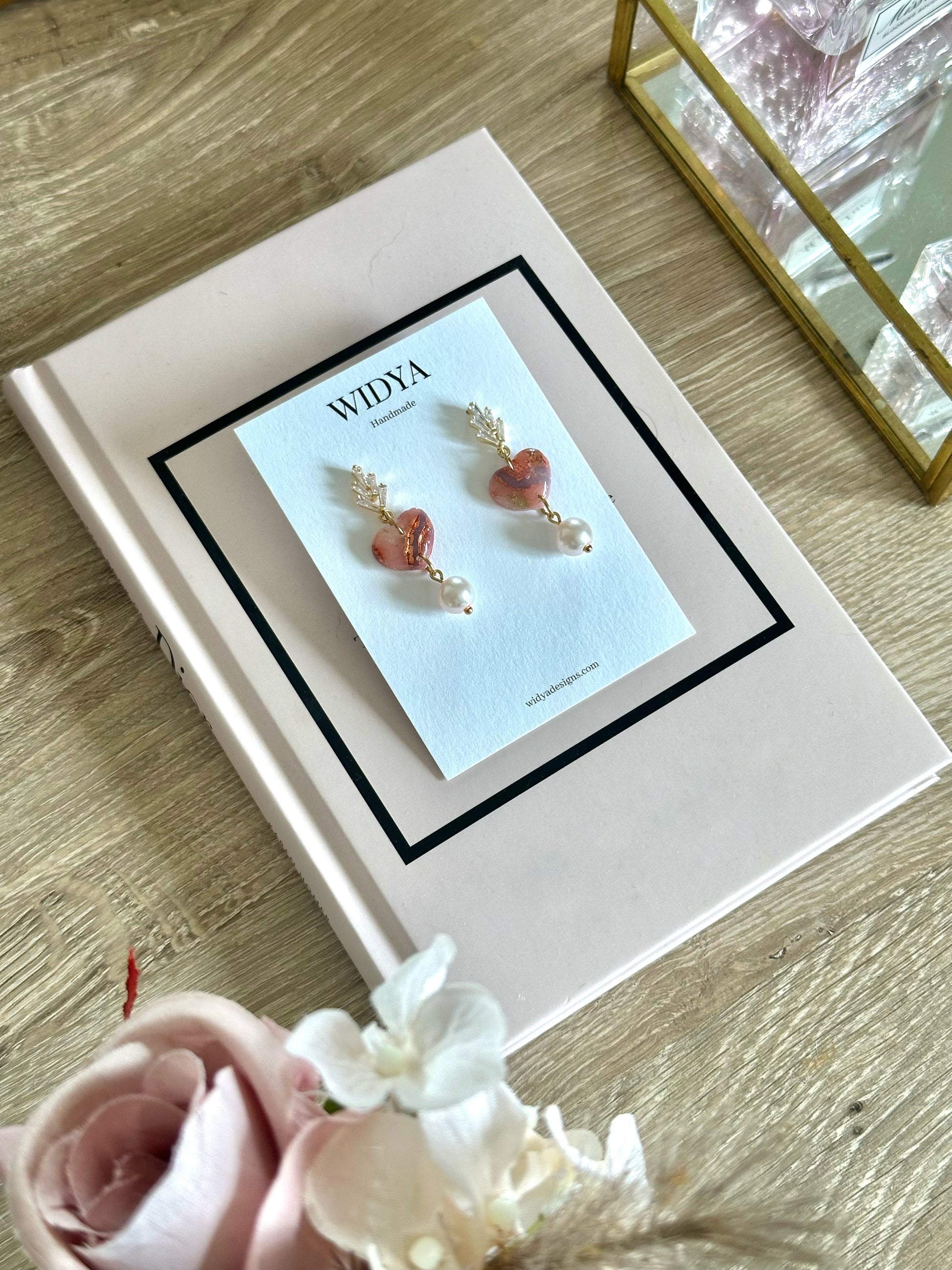 A stunning fusion of artistry and elegance, these handmade earrings capture the beauty of pink agate with meticulously layered details. Each piece is carefully crafted to resemble the mesmerizing patterns of natural stone, creating a unique, gemstone-inspired look. Accented with delicate pearls, these earrings add a touch of charm and sophistication to any style. Handmade with love, designed to elevate.