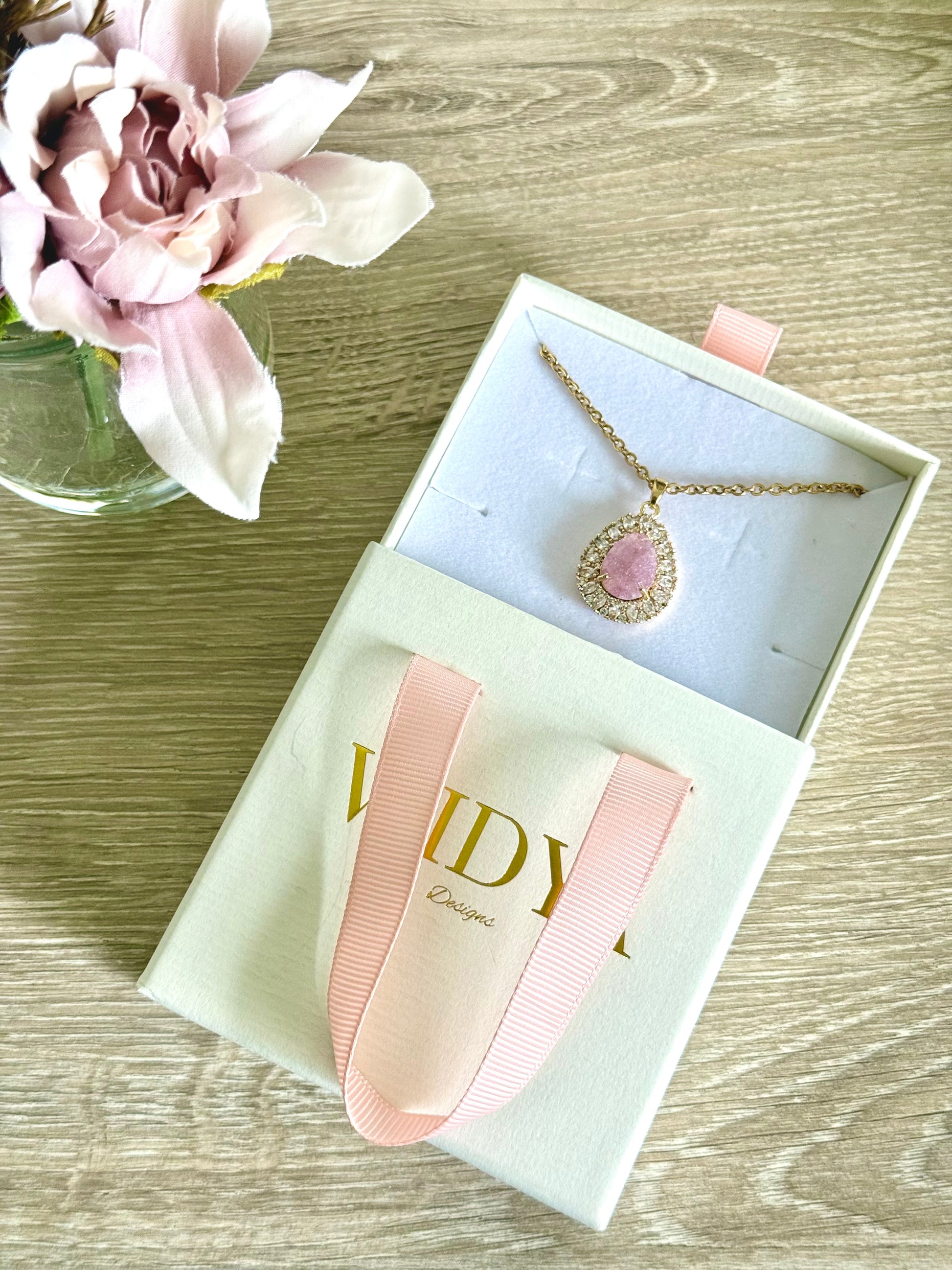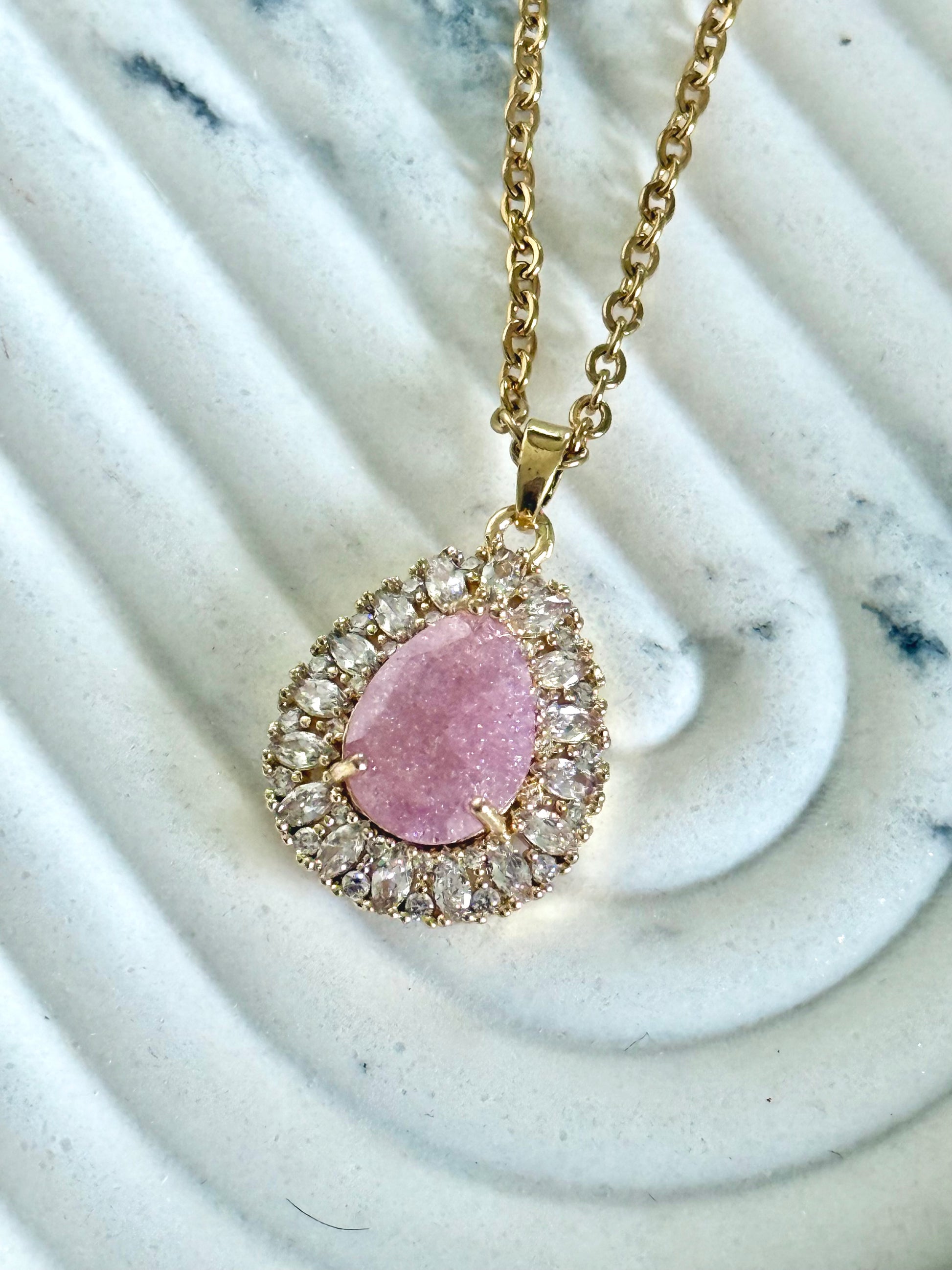 A little sparkle goes a long way! This dainty necklace features a pink cubic zirconia teardrop pendant set in gold-plated brass, catching the light with every movement. The 18K gold PVD stainless steel chain is durable, non-tarnish, waterproof, and hypoallergenic, making it perfect for adding a subtle pop of shine to your everyday style or special occasions.