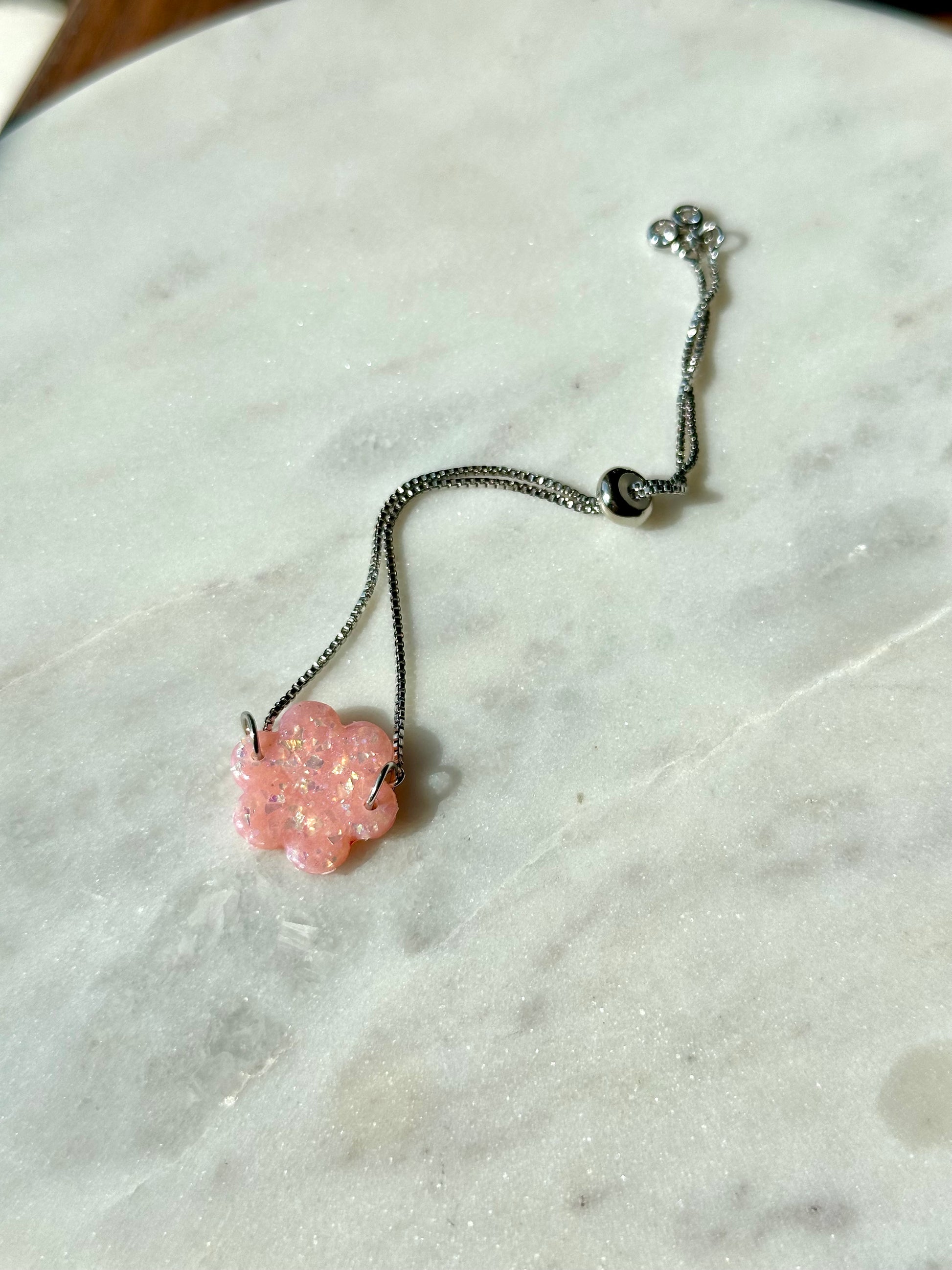 Delight in the charm of our pink opal flower bracelet, handcrafted from polymer clay to look just like real gemstones! This adorable accessory brings a magical sparkle to your wrist, perfect for adding a touch of whimsy and elegance to any outfit.