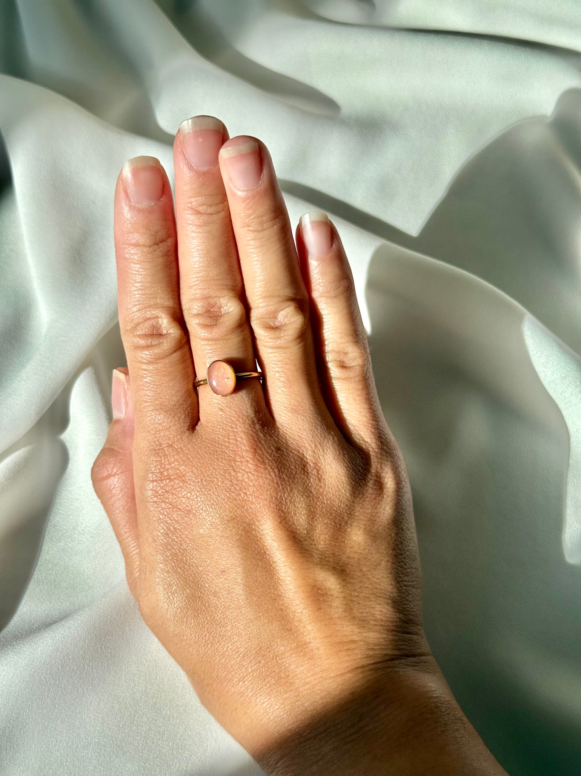 Elevate your style with this adjustable, high-quality oval-shaped ring features a handmade polymer clay center inspired by the soft shimmer of pink opal. Elegant, versatile, and full of artisanal detail.