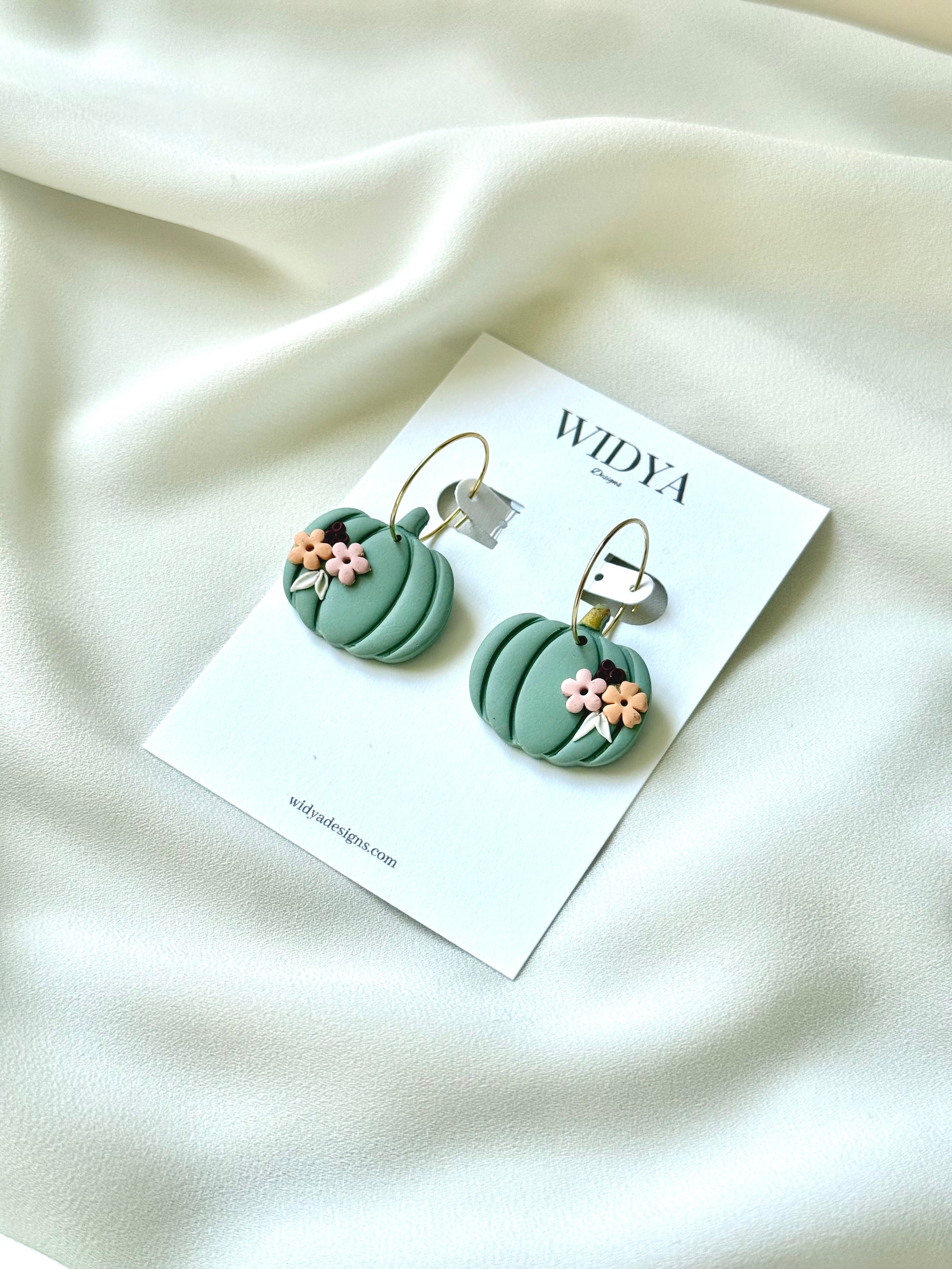 A soft twist on fall — these teal pumpkin earrings bloom with delicate floral accents, blending cozy autumn vibes with a touch of whimsy. Perfect for those who love seasonal charm with a splash of color and sweetness.