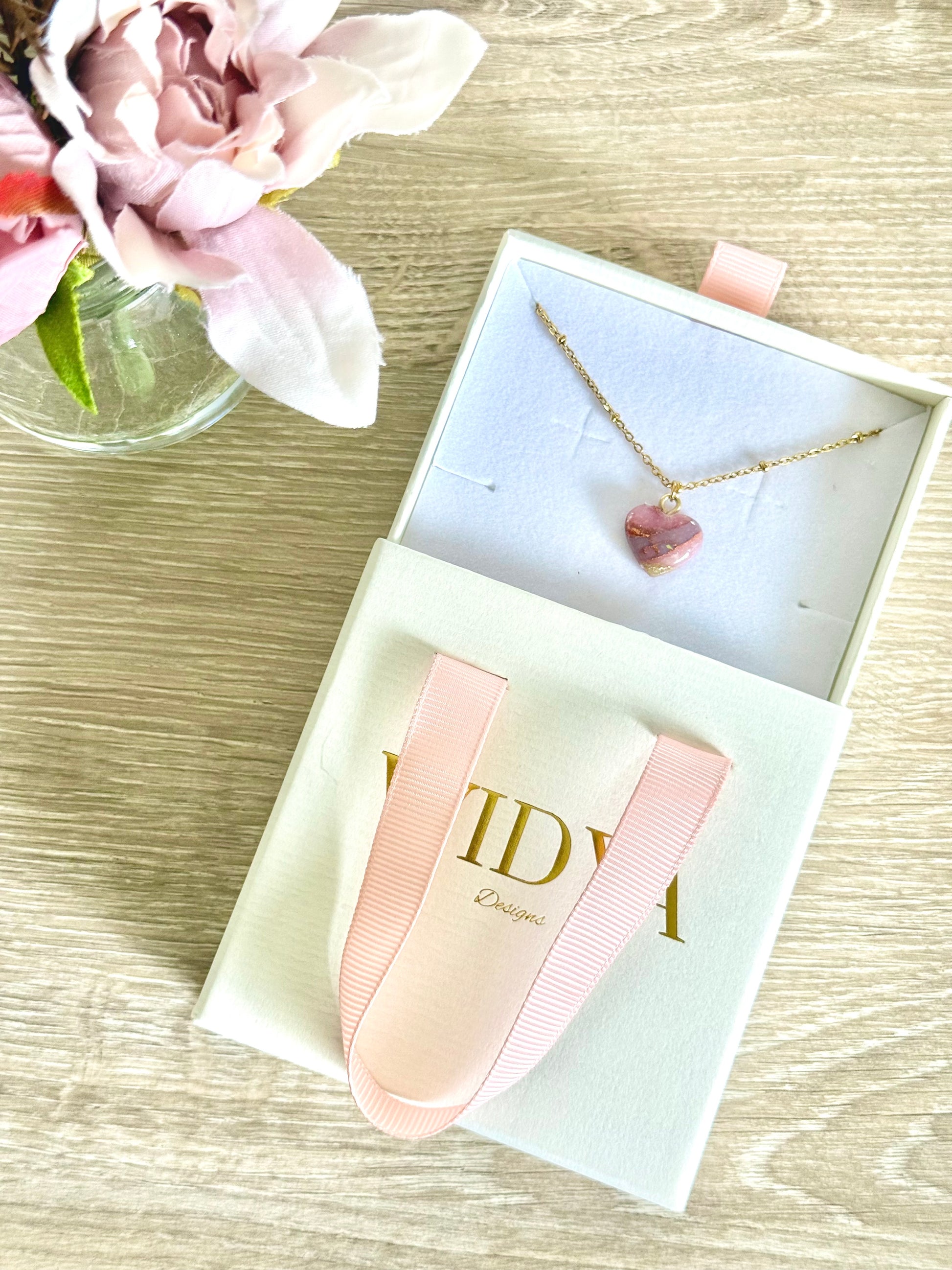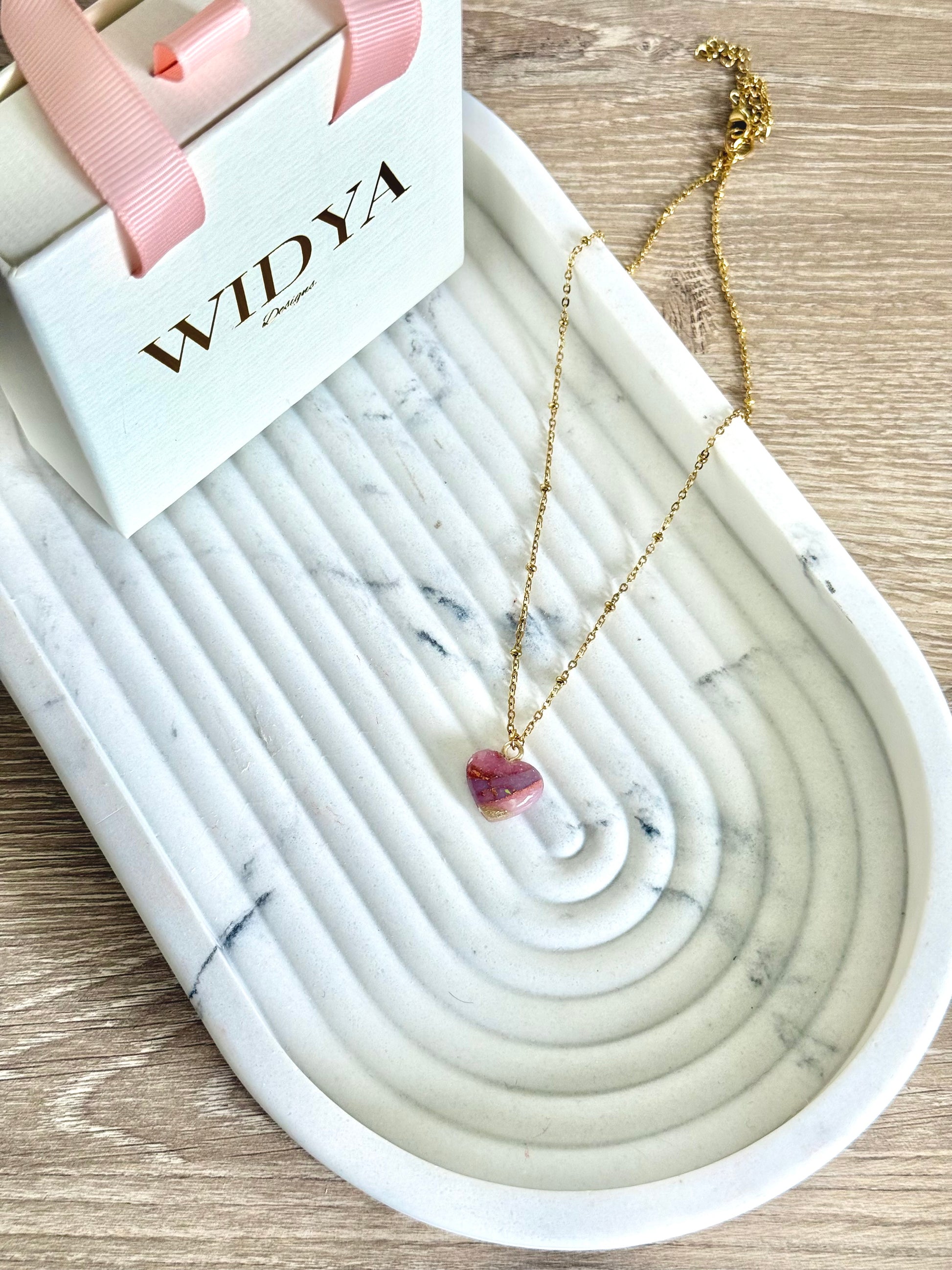 Sweet, soft, and full of love, this handmade heart pendant is crafted from polymer clay and inspired by the gentle hues of rose quartz. A symbol of love and kindness, it adds a tender touch to any outfit. Strung on an 18K gold PVD stainless steel chain that’s non-tarnish, waterproof, and hypoallergenic, this necklace is a wearable reminder to carry a little love wherever you go.