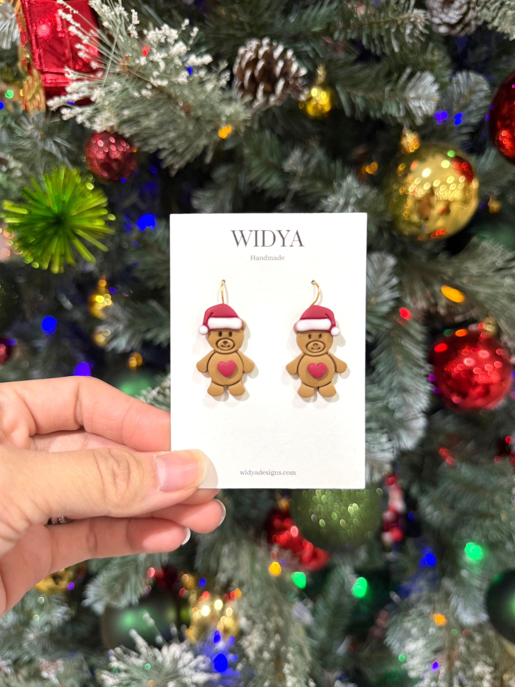 Cozy charm meets festive sparkle! These handmade earrings feature an adorable teddy bear in a Santa hat. A cuddly touch of Christmas charm, perfect for gifting or keeping close.