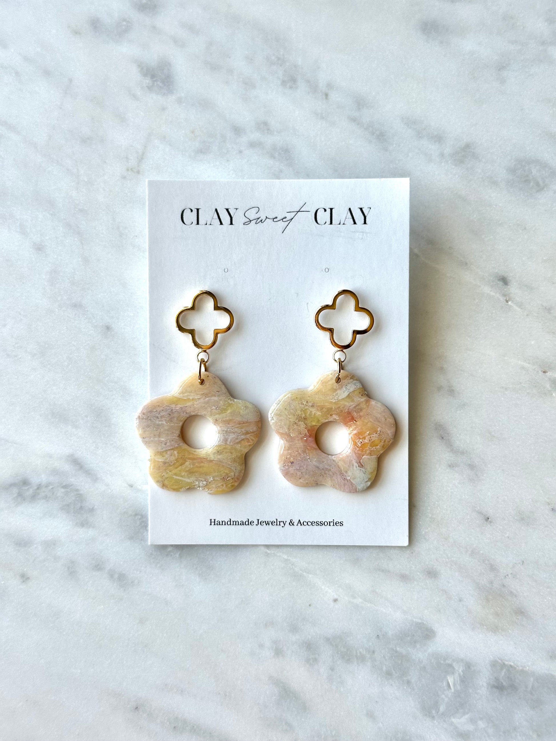 These exquisite flower-shaped earrings are crafted from polymer clay and inspired by the beauty of sunstone gemstones. Lightweight yet striking, it captures the essence of real stone with effortless elegance