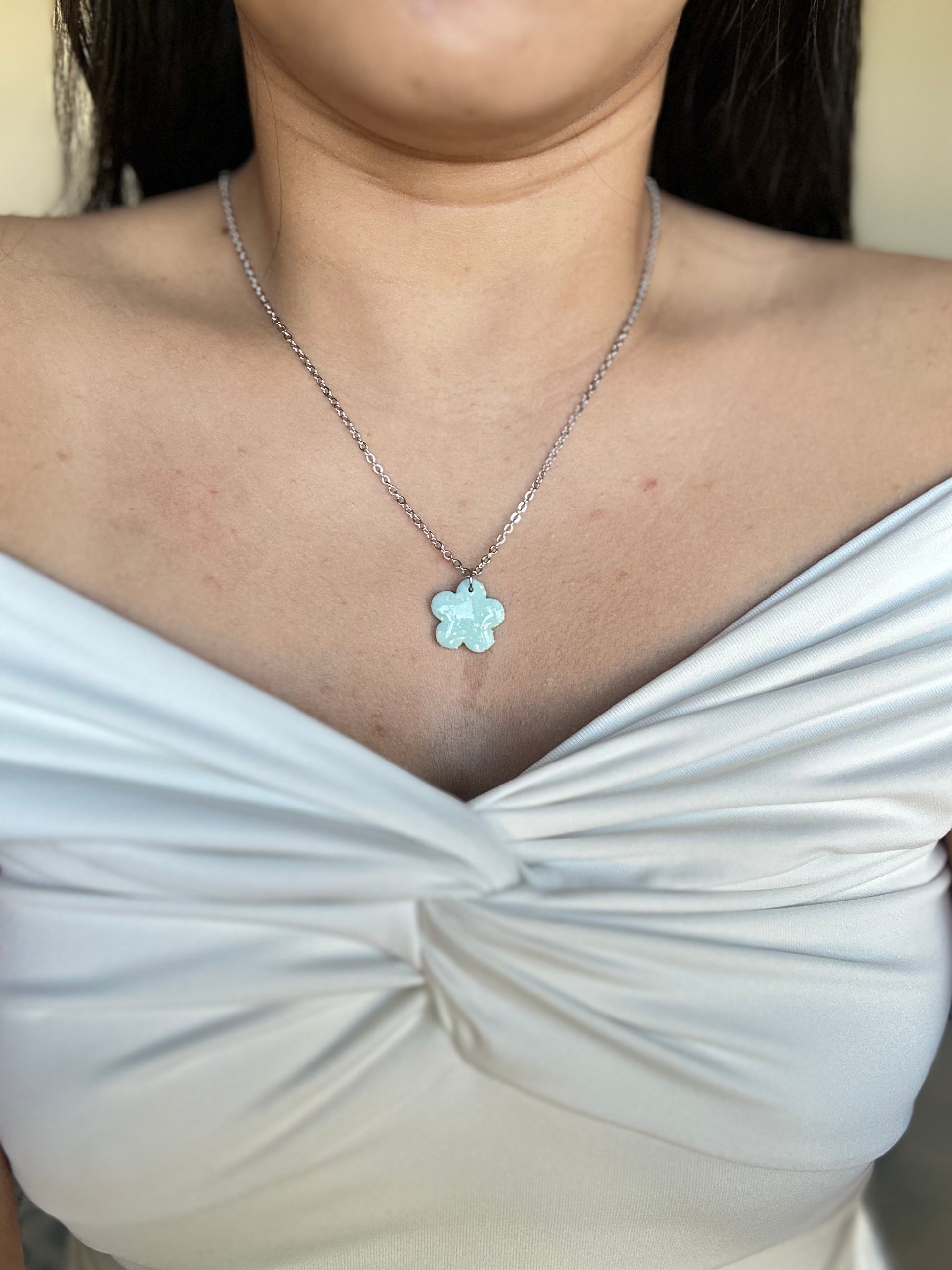 Our teal opal flower necklace is a delicate masterpiece, handcrafted from polymer clay to capture the enchanting glow of real gemstones. Light as a feather, this dainty design adds a subtle touch of magic and elegance to your everyday style. Perfect for those who love timeless, nature-inspired jewelry.