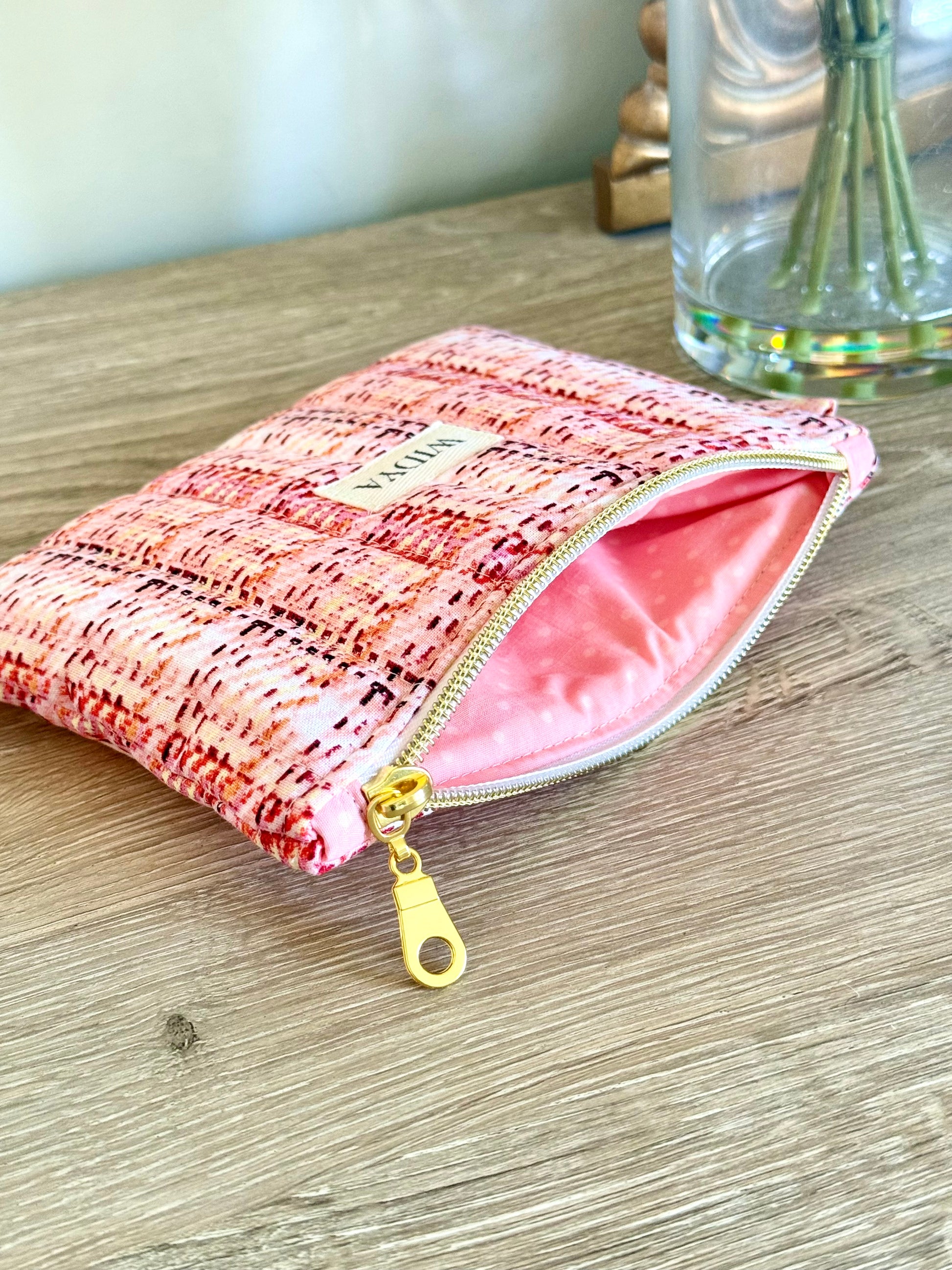 A cozy classic with a modern twist. This handmade small flat pouch features a vibrant orange with pink-ish tweed print—warm, textured, and full of character. Thoughtfully quilted for durability and charm, each piece is crafted from soft cotton and padded for structure.