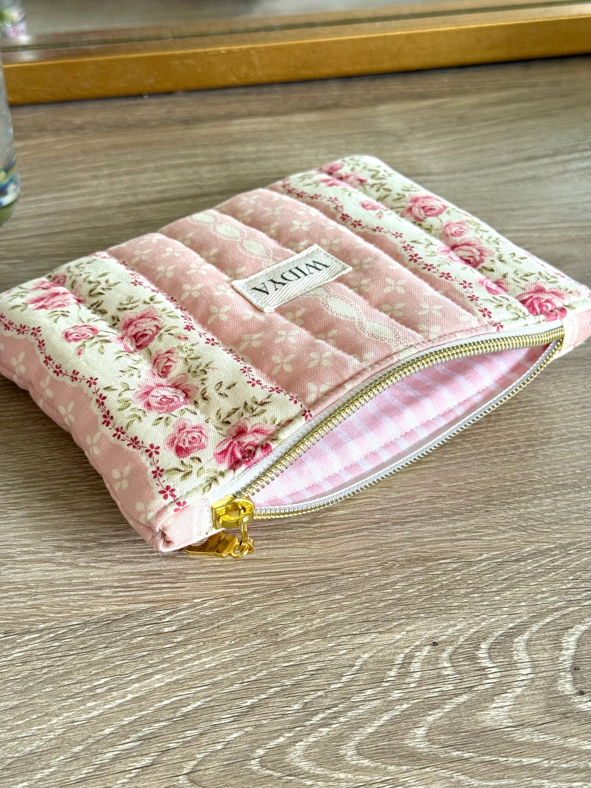 Timeless and romantic, this handmade quilted pouch features a delicate vintage pink rose print. Made from 100% cotton and fully lined for durability, it's perfect for keeping your cosmetics, small essentials, or travel items beautifully organized. A soft, elegant piece that brings a touch of classic charm to your purse organization.